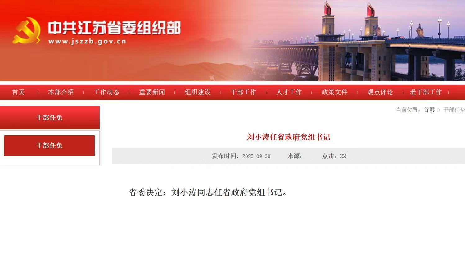 江苏省委决定:刘小涛同志任省政府党组书记。