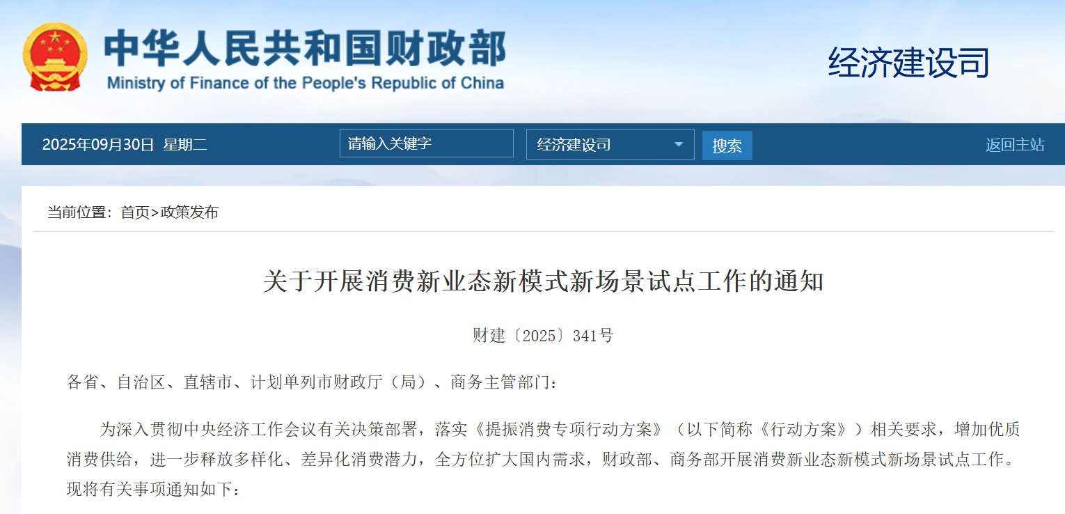9月30日,财政部、商务部发布《关于开展消费新业态新模式新场景试点工作的通知》,将遴选50个左右城市,开展消费新业态新模式新场景试点,增加优质消费供给,进一步释放多样化、差异化消费潜力,全方位扩大国内需求。