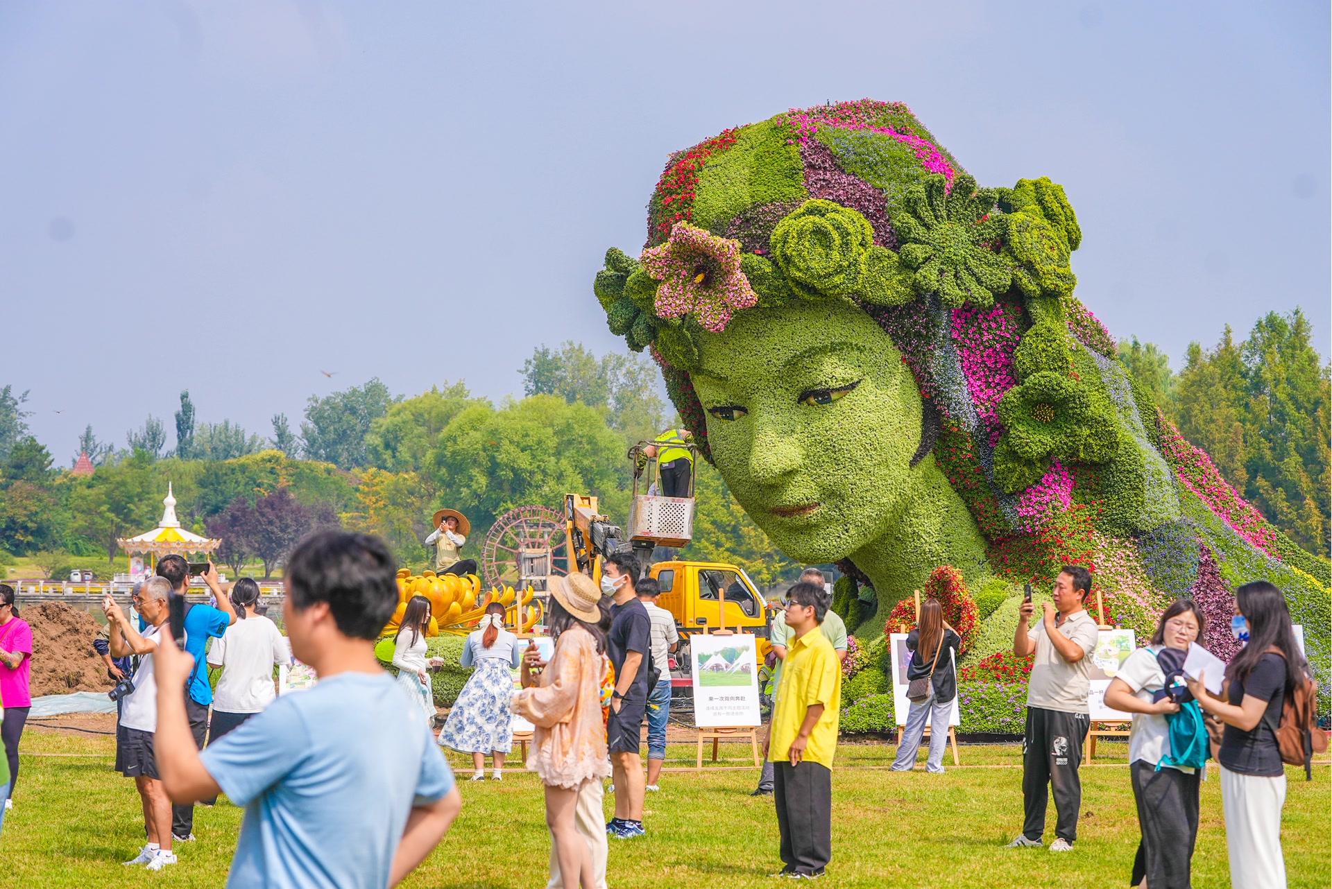 园区内23处网红打卡装置也将在双节假期以最美姿态迎接游客。巨型“花神归家”立体花坛更是成为园区焦点,繁花装点的头饰、如瀑的花发与菊花地摆相互呼应,让游客深切感受花神与菊韵的交融之美。
