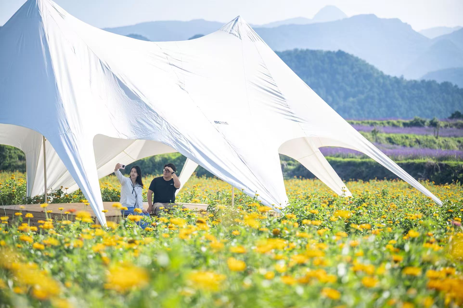 玩累了,还可以在营地帐篷里住宿。紫谷伊甸园花间营地露营区占地约120亩,有18间轻奢露营帐篷、30多亩的自助露营区。其中,轻奢露营帐篷配备齐全,游客可拎包入住。营地还提供专业天幕、烧烤设施等配套服务,满足不同游客的需求。