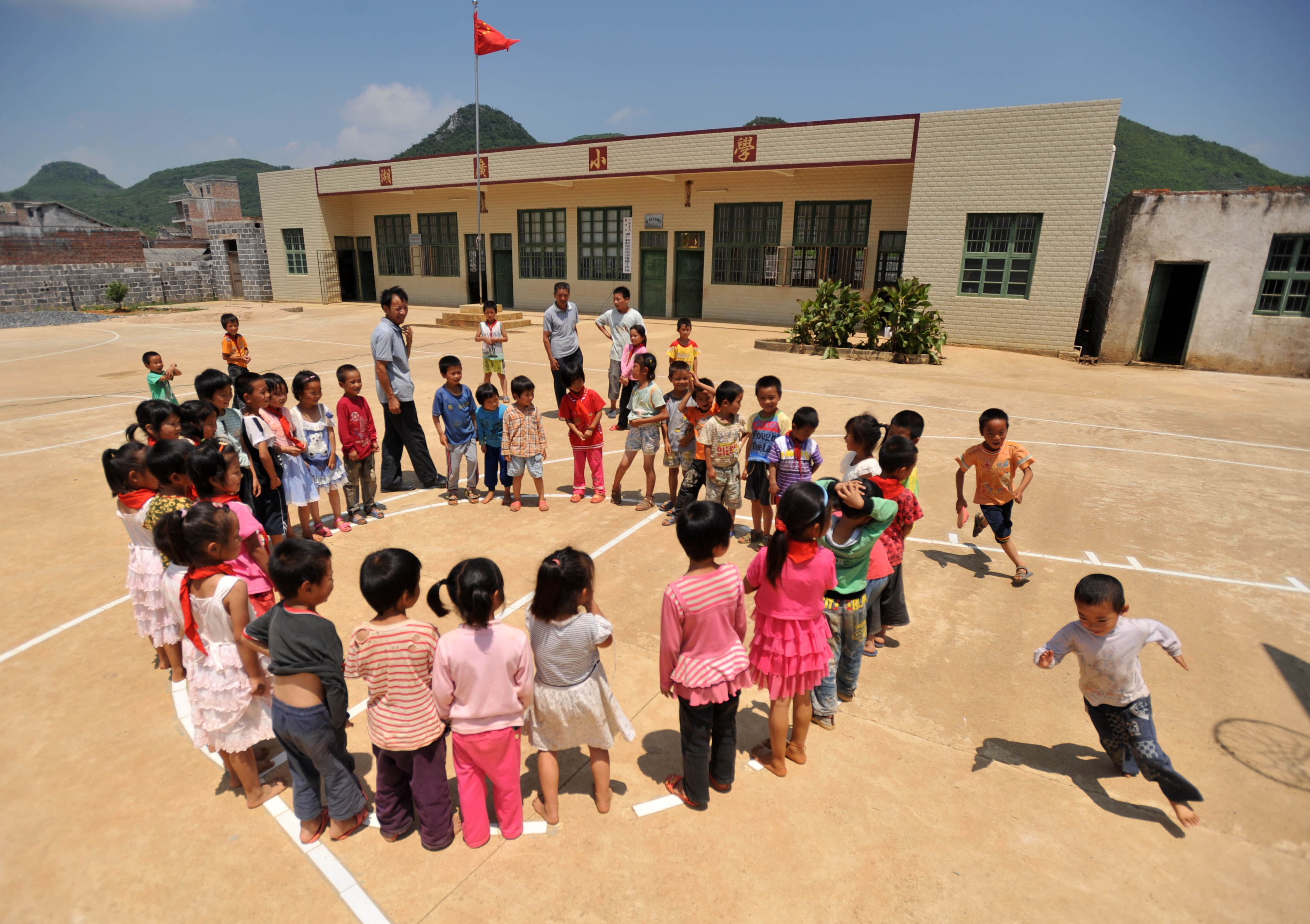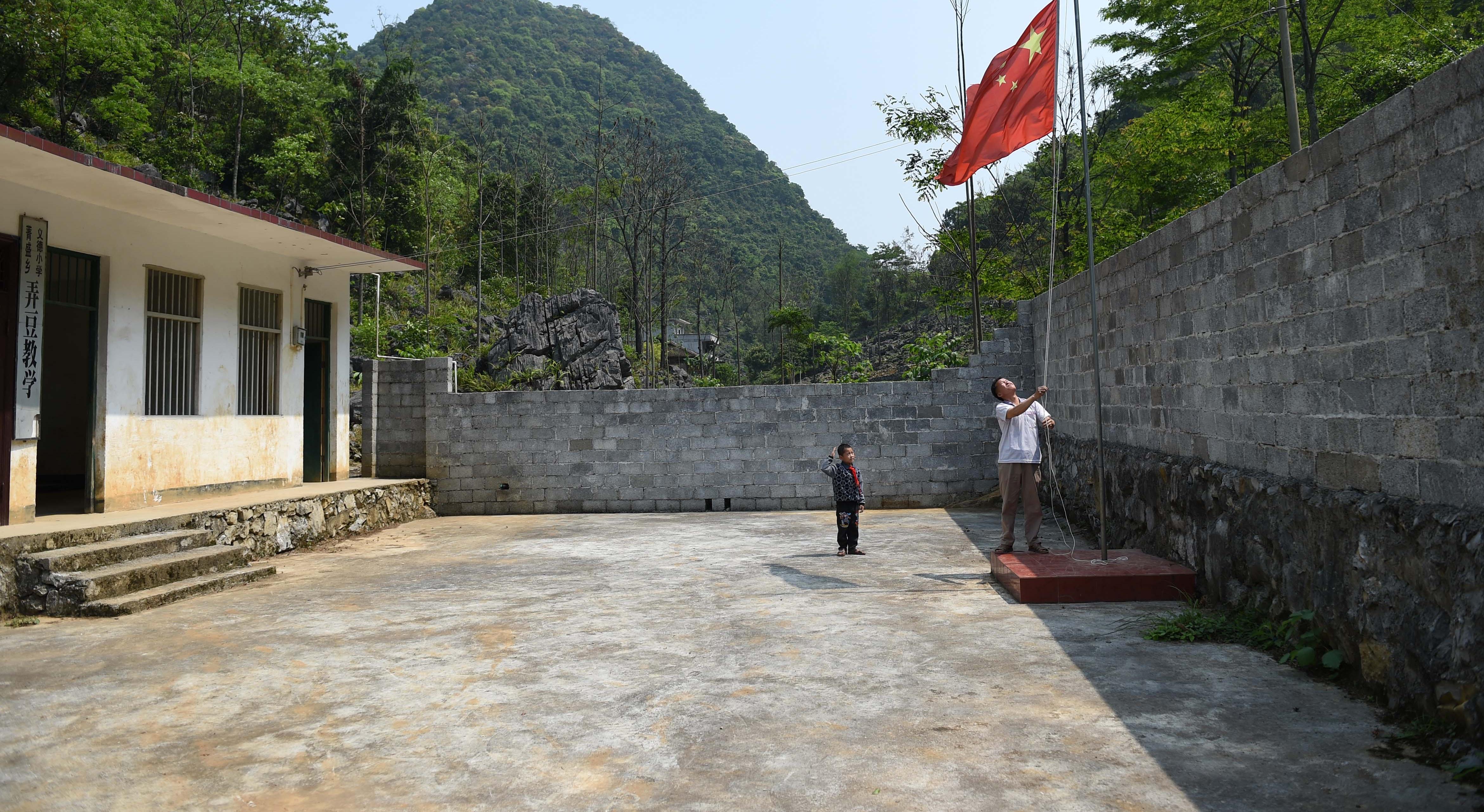 大山教学点,很多学校只有小学一到三年级学生,有的只有一、二年级几个小孩。由于学生幼小,无法独自担当升旗手,很多老师不管年龄多大,都要自己担当这个神圣的角色,扛起国旗站到旗杆下跟着国歌的节拍,拉着手中的绳子抬头仰望国旗升起。