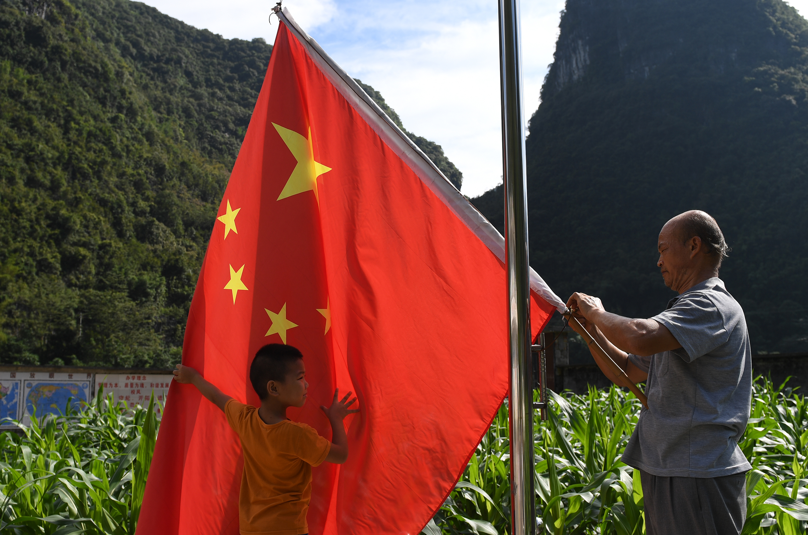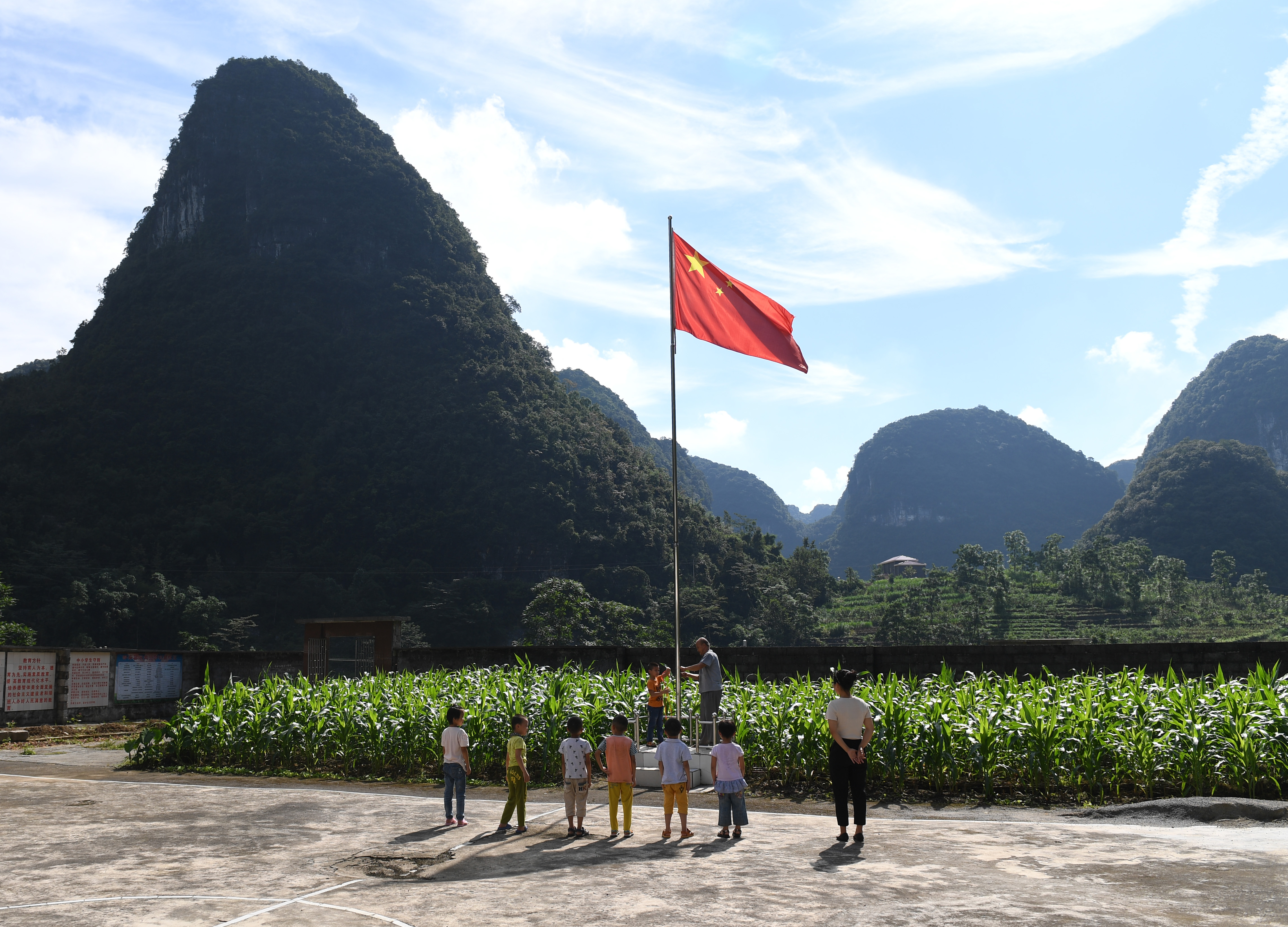 这样的画面也让我不禁想起40多年前我幼时亲历的场景:我上小学的学校位于桂西北巍巍大山之中。那个年代,大山条件非常艰苦,校舍是简陋的砖瓦结构房子,没有电,不通公路,从学校到乡镇所在地单程要走5个多小时的山路。就是在这样的条件下,学校依然坚持升国旗。没有旗杆,学校校长黄启福选了校园里一棵高高的椿树,请人爬上去把树枝树叶削掉,他用木头亲手制作一个滑轮固定在椿树顶部,装上绳子,每周一让全校师生在那棵椿树下的泥地上集合,他拿来自己的收录机,装上电池和磁带,咔嗒咔嗒按下音乐播放键,国歌响起,国旗升起——这是第一次参加升国旗仪式,我仍记忆犹新。