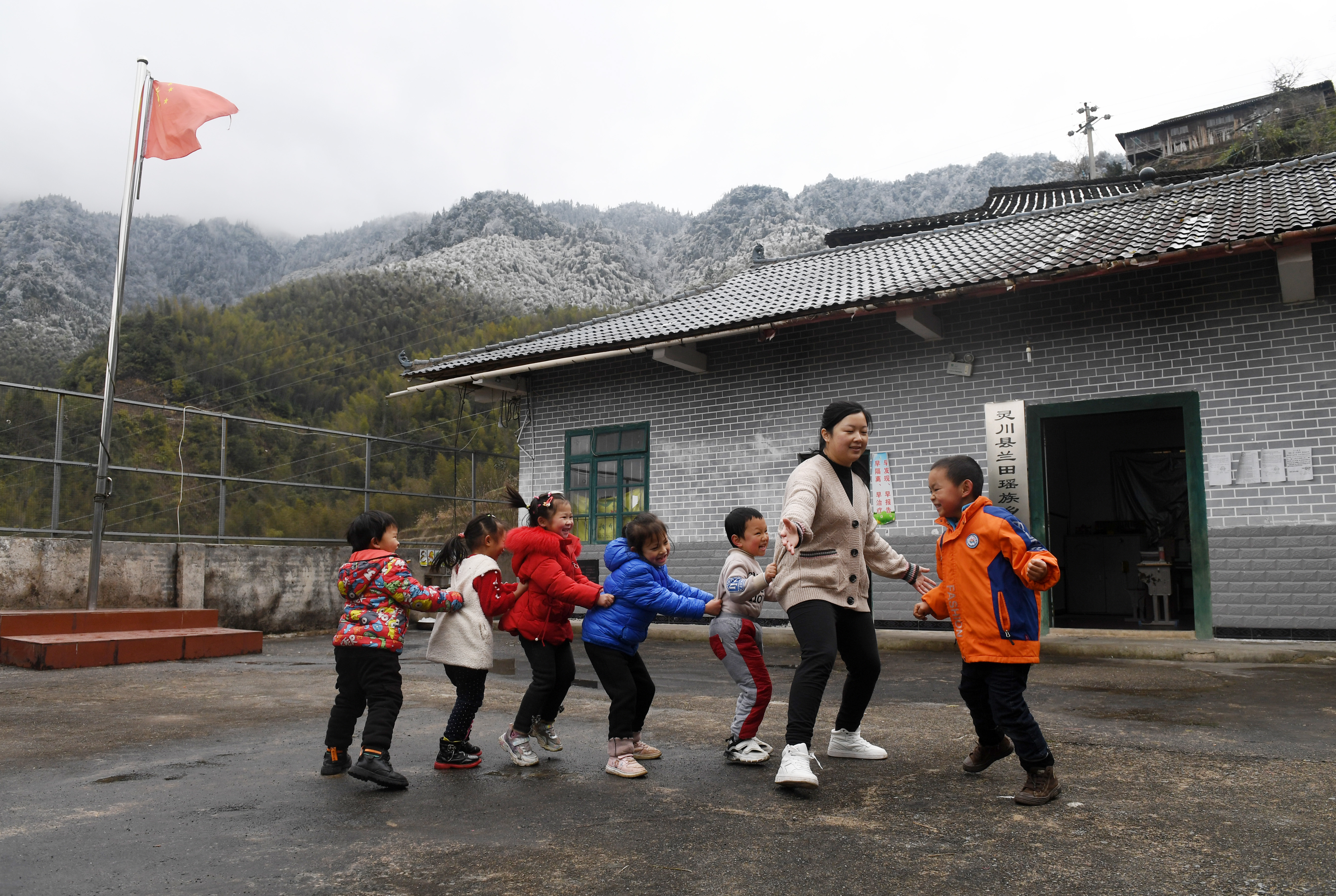 山头白雪皑皑,檐下冰凌滴水。严寒的天气里,一位老师领着六个学生在校园里唱国歌、升国旗,老师和一名学生作为升旗手,五名学生站成一排,向正在升起的国旗行队礼和注目礼。升旗仪式结束后,国旗在校园上空高高飘扬,那抹最神圣的中国红不仅温暖了寒风中的学校,还温暖了学校所在的山寨。