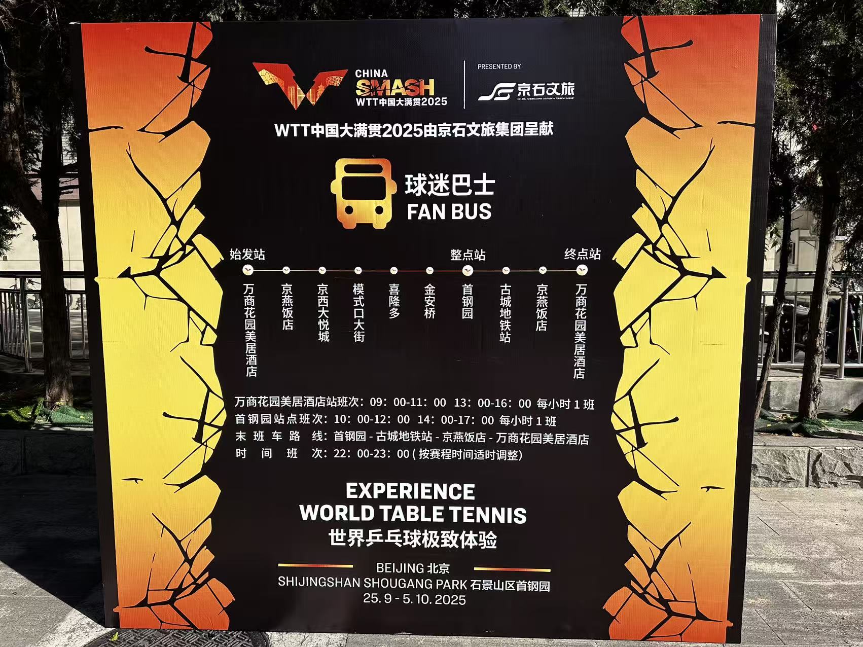 WTT期间,安排2辆双层移动主题豪华巴士,每日7班循环运营,设置日常循环和夜间末班车接驳路线,球迷可免费乘坐。