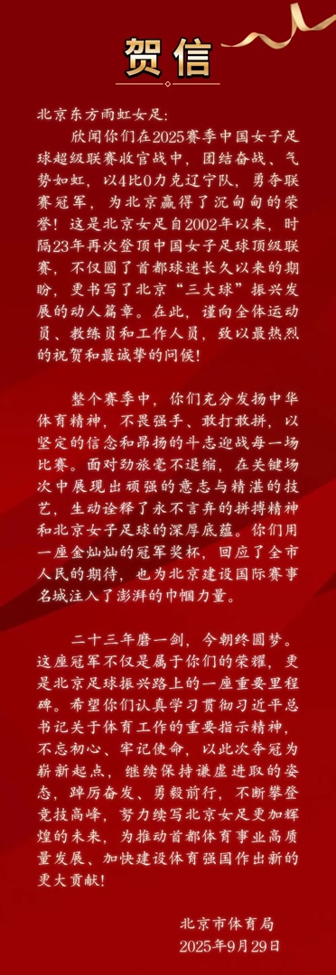 欣闻你们在2025赛季中国女子足球超级联赛收官战中,团结奋战、气势如虹,以4比0力克辽宁队,勇夺联赛冠军,为北京赢得了沉甸甸的荣誉!这是北京女足自2002年以来,时隔23年再次登顶中国女子足球顶级联赛,不仅圆了首都球迷长久以来的期盼,更书写了北京“三大球”振兴发展的动人篇章。在此,谨向全体运动员、教练员和工作人员,致以最热烈的祝贺和最诚挚的问候!