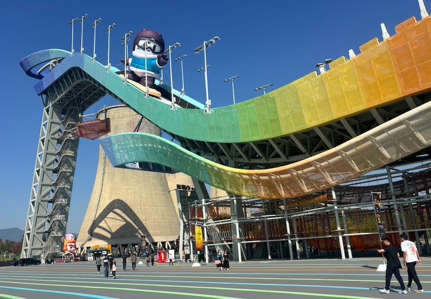 30日上午10时许,大批观众已经来到滑雪大跳台入口处排起了长队。步入大跳台区域,多巴胺配色的糖果季街区首先映入眼帘,观众可以边逛边吃,还能亲手制作糖果。大跳台脚下的用餐区坐满了游客,不少人沐浴着秋日阳光品一杯咖啡,抬头望去,体验“玩酷心跳塔”高空项目的游客不时传来尖叫声。