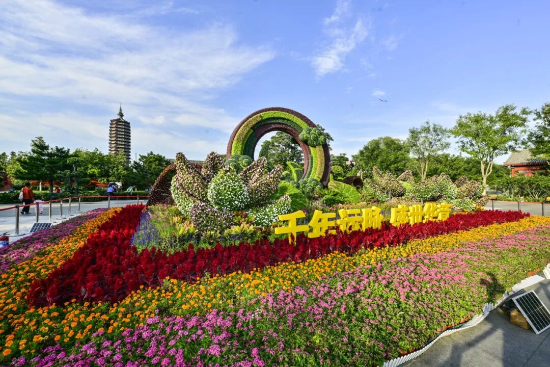 前方则以绿色绿植为底、黄色花卉为纹,精准复刻通州区标志性建筑——燃灯塔,塔檐的飞翘弧度、塔身的砖纹细节都力求还原,千年古塔的庄重典雅在花海中静静绽放,成为连接历史与当下的纽带。