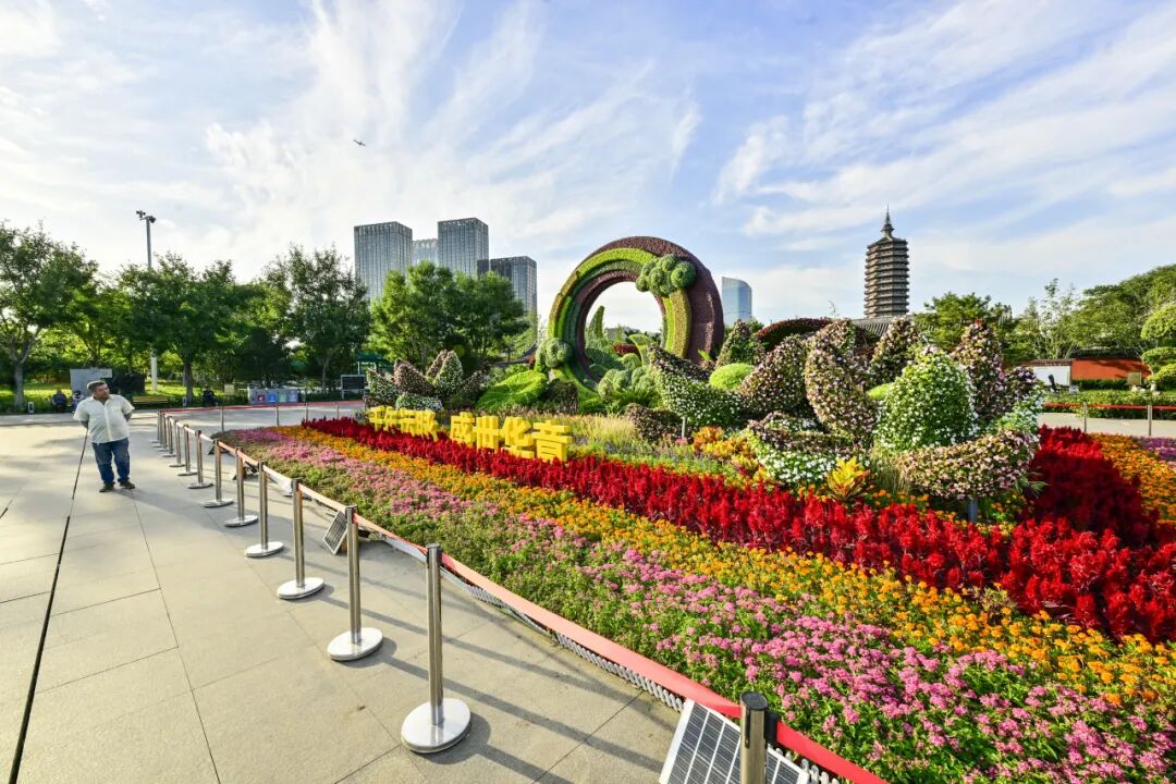 在大运河文化旅游景区南区主通道的“运河情”主题花坛,则将双节的“家国情怀”与副中心发展活力紧密相连。