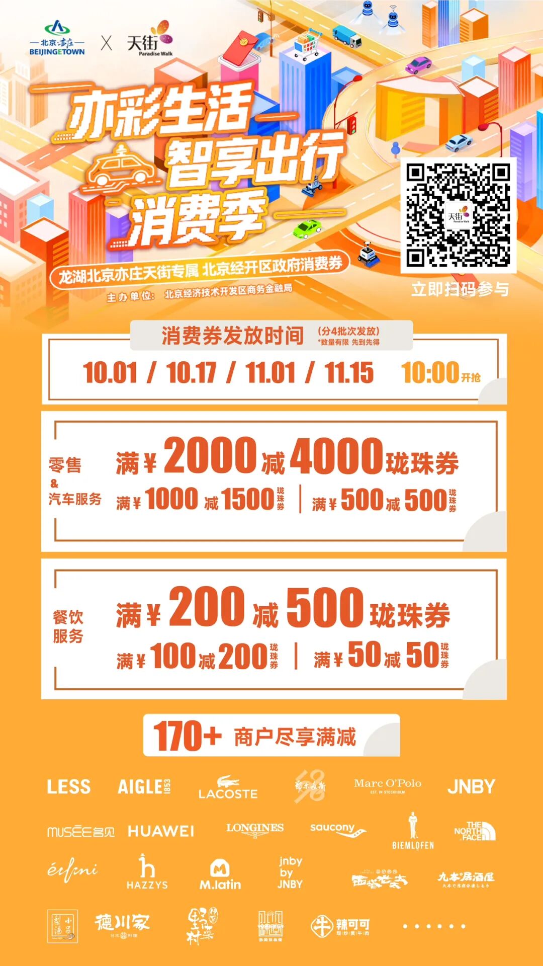 本次活动商务金融局联动“2025GT世界挑战赛”、“2025世界智能网联汽车大会”、北京经开区“超级杯”足球赛,于2025年10月1日-2025年11月30日开启“亦彩生活·智享出行消费季”。本次消费季共计发放消费券2000万元。