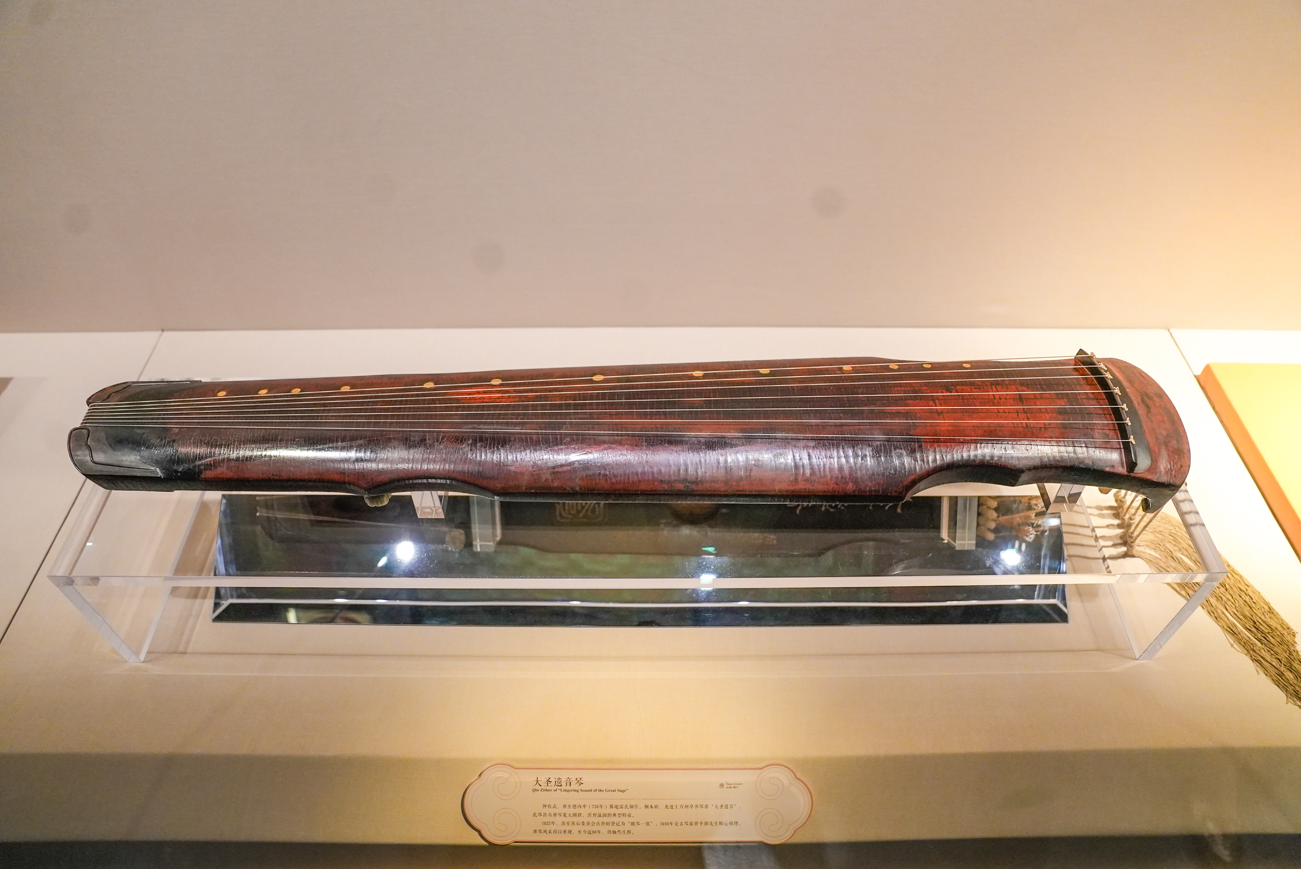 大圣遗音琴为唐肃宗至德元年(756年)宫廷制作的宫廷礼仪用琴,采用神农式造型,通长120厘米,桐木面板配栗壳色漆底,琴体遍布蛇腹断与细牛毛断纹,龙池上方镌草书琴名,两侧刻十六字隶书铭文及篆印,琴腹内朱漆隶书“至德丙申”款,印证其制作于安史之乱后新皇登基之际的历史背景。