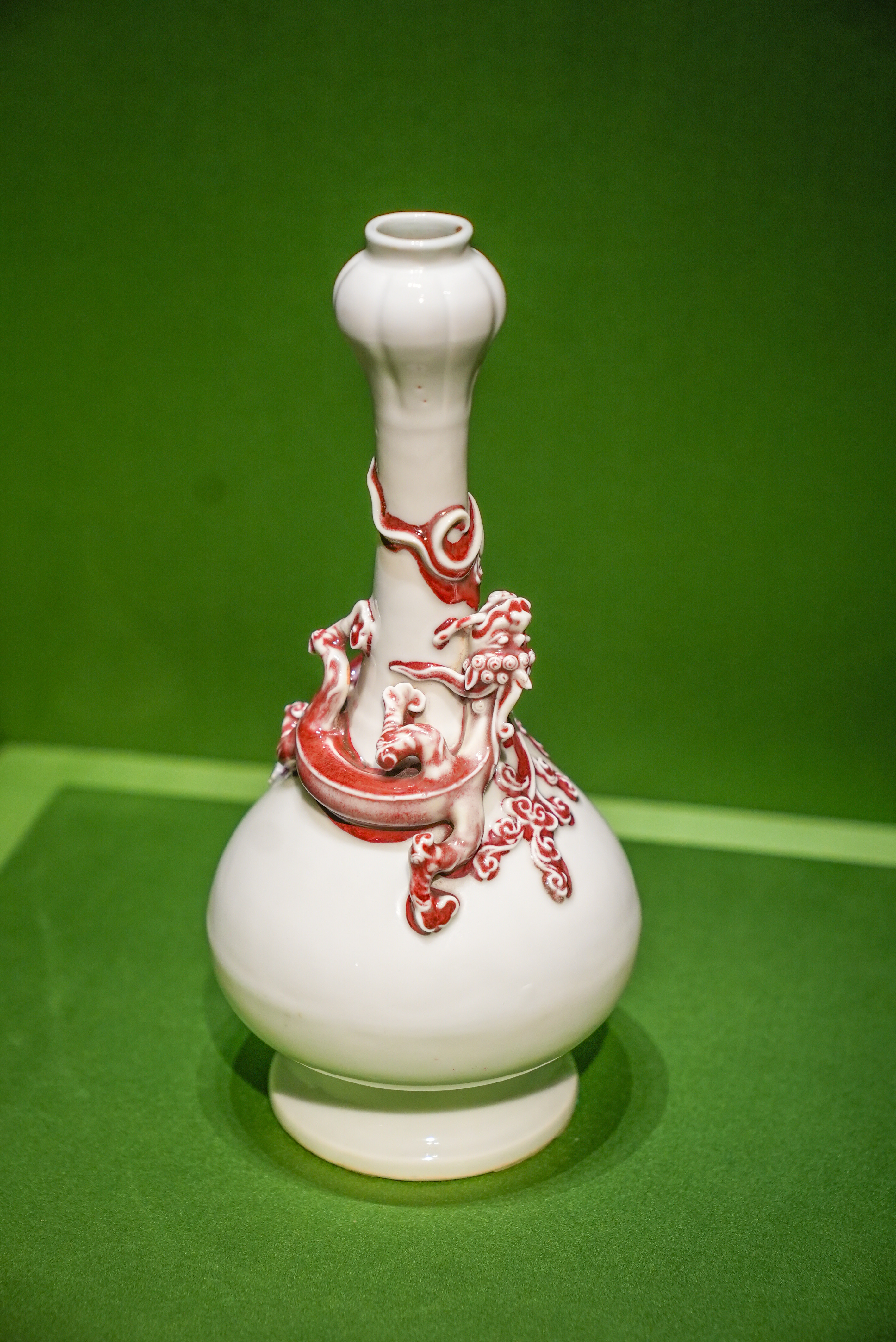 白釉贴塑鲜红蟠螭蒜头瓶(明)