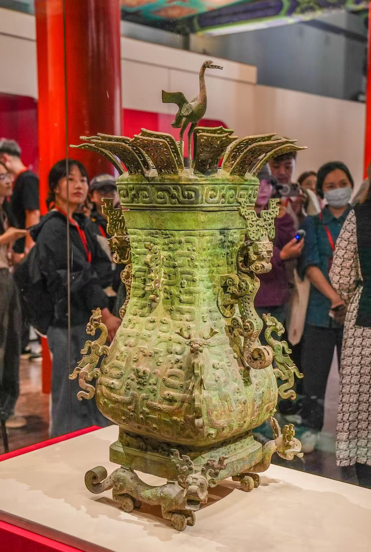 河南博物院镇馆之宝的“同胞”。仙鹤、双龙耳与器身主体采用分铸法,既显示了高超的铸造技术,也反映了当时青铜器上动物造型肖像化的潮流。