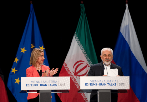△2015年,时任欧盟外交和安全政策高级代表莫盖里尼同时任伊朗外长扎里夫出席伊朗核问题会议。