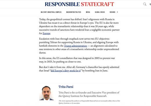美国昆西研究所副主任特里塔·帕西指出,今天的“E3”与2003年刚成立时相比,目标与语境已发生根本变化。当前欧盟推动制裁,与其说是为了防扩散,不如说是出于地缘战略的重新定位。