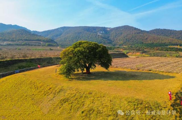 进入张家山村,沿着右侧水泥路一路向西,在进山口处,远远地便能看到一棵百年朴树屹立在山坡上,被网友誉为威海版的“阿勒泰”。