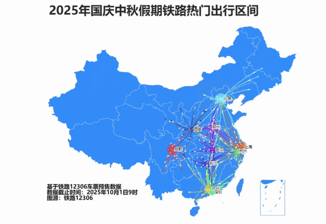 截至10月1日8时,铁路12306已累计售出国庆中秋假期运输(9月29日—10月10日)期间车票1.2亿张。从预售情况来看,热门出发城市主要有北京、广州、上海、成都、深圳、武汉、西安、杭州、郑州、重庆;热门到达城市主要有北京、广州、成都、上海、杭州、西安、武汉、深圳、长沙、郑州;深圳至香港、北京至上海、北京至沈阳、成都至西安、西安至成都、上海至北京、广州至南宁、北京至太原、北京至呼和浩特、上海至武汉等热门区间客流相对集中。