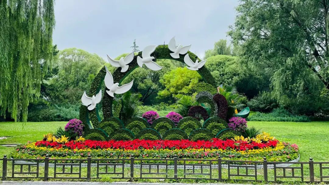 今年国庆期间,东长安街沿线共布置了5组主题花坛,包括建国门西北角“和平发展”主题花坛、东单东北角“光辉历程”主题花坛、东单东南角“黄河赞歌”主题花坛、东单西北角“继往开来”主题花坛、东单西南角“锦绣山河”主题花坛,描绘了祖国繁荣昌盛、人民安居乐业的中国式现代化新篇章。5组花坛从中国人民抗日战争暨世界反法西斯战争胜利80周年纪念活动布置后延续至国庆节,进行元素更换和植物调整,保证呈现最佳的景观效果。