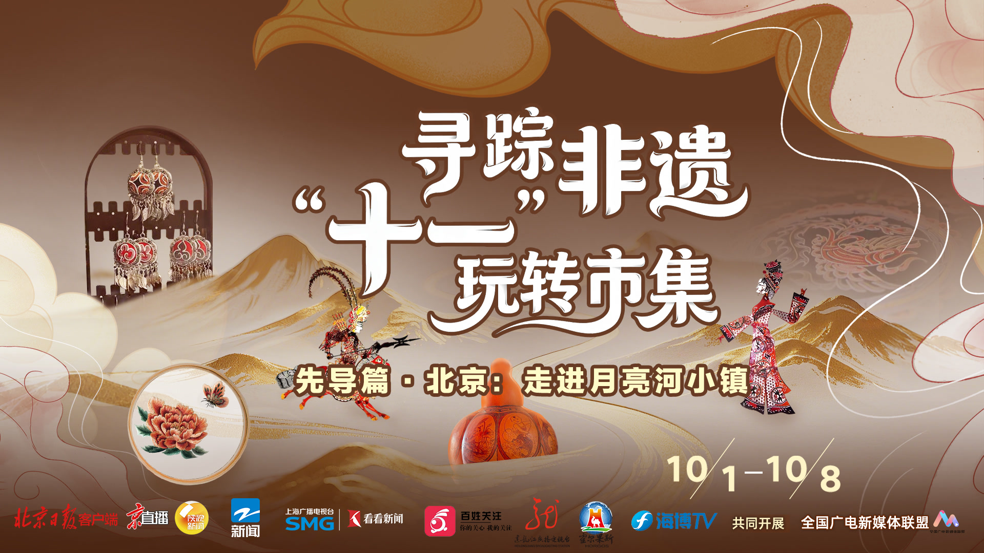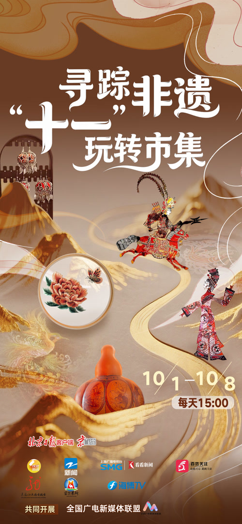 非遗焕新,“十一”寻踪。国庆中秋双节假期,北京日报客户端京直播、上海广播电视台融媒体中心、陕西广电融媒体集团新闻中心、浙江新闻频道、贵州广播电视台公共频道、黑龙江广播电视台、霍尔果斯融媒、海博TV共8家媒体联合推出系列直播,每天一场时长50分钟的新媒体直播——《寻踪非遗 “十一”玩转市集》。