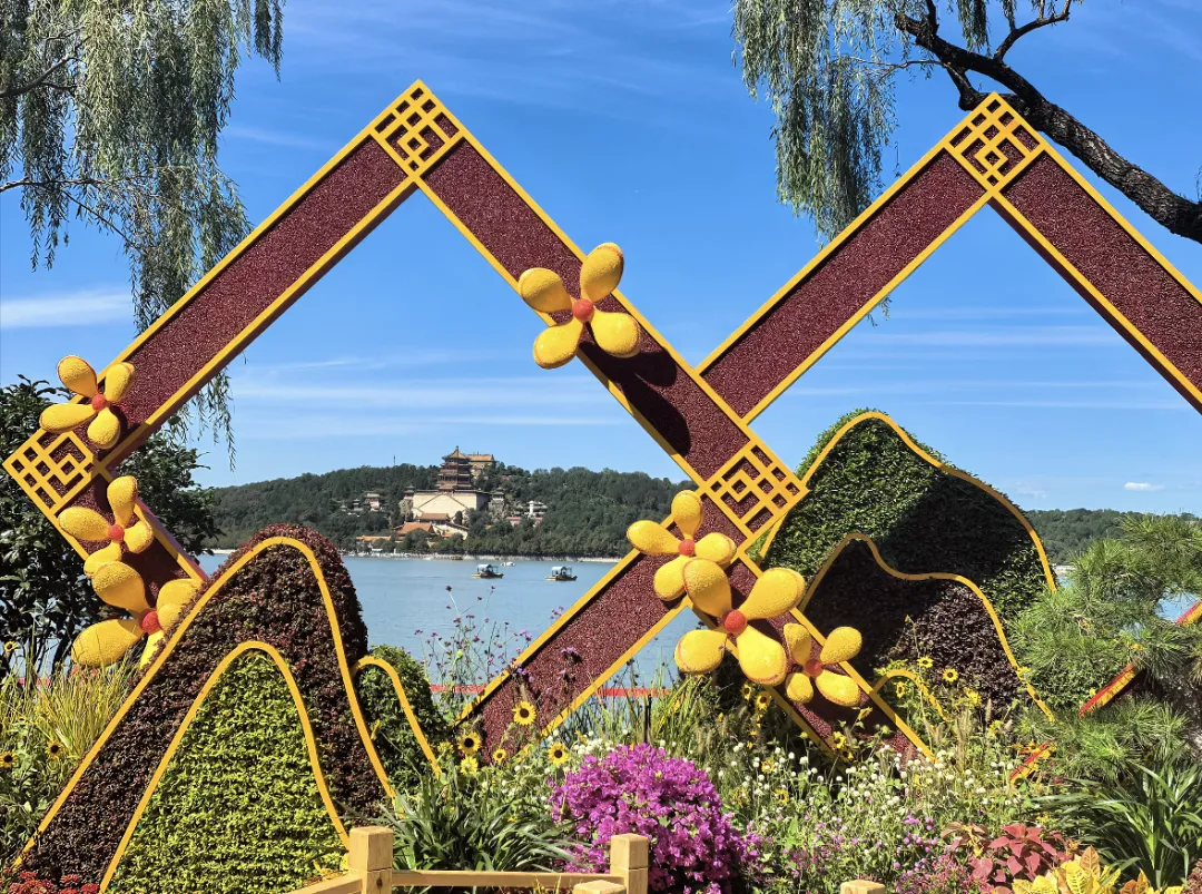 十七孔桥东侧湖边的“湖山方胜”花坛