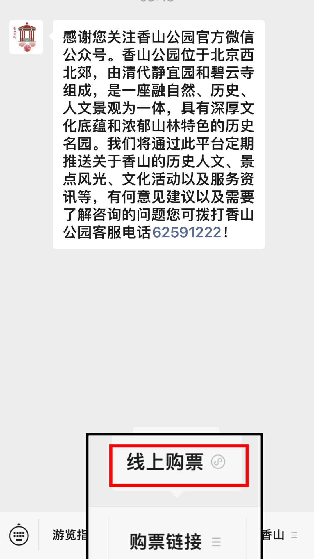 香山公园无需预约,您可直接通过微信公众号下方的购票链接线上购票,也可来园在门区现场购票,票量充足,请您放心游览。公园游览年票也可正常使用。