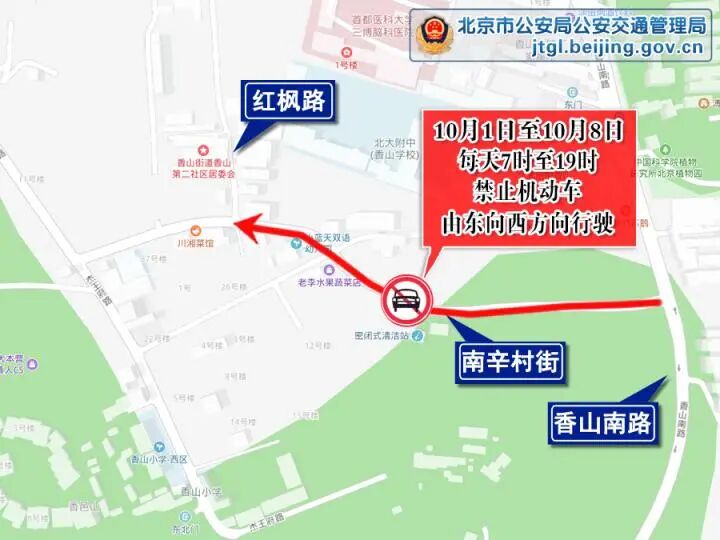 据交管部门消息,假期期间,香山地区将采取临时交通管理措施:10月1日至10月8日,每日7时至19时,海淀区南辛村街(红枫路至香山南路段)禁止机动车由东向西方向行驶。
