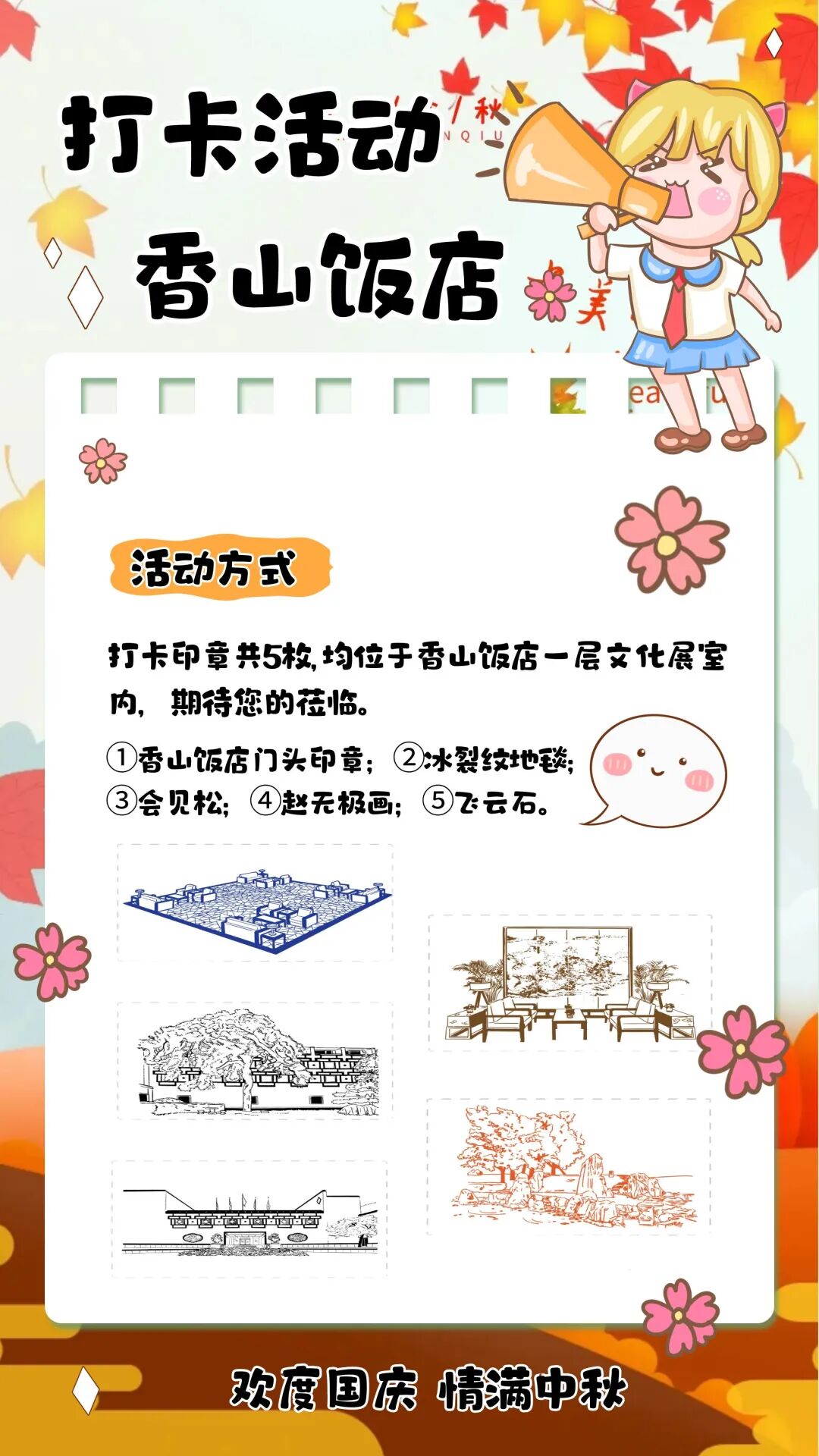 专为喜爱探索与收集的年轻游客及亲子家庭设计。游客可在公园指定地点领取精美的 “香山玉牒”集章手册,按图索骥,在园内寻找34枚免费主题印章进行打卡收集。同时,由国际著名美籍华裔建筑设计师贝聿铭先生主持设计的香山饭店内,也有5枚印章,更有特色茶点,等您去寻找。此路线将引导游客穿梭于园林与古迹之间,在“寻宝”的乐趣中深入了解香山文化,极具互动性与趣味性。