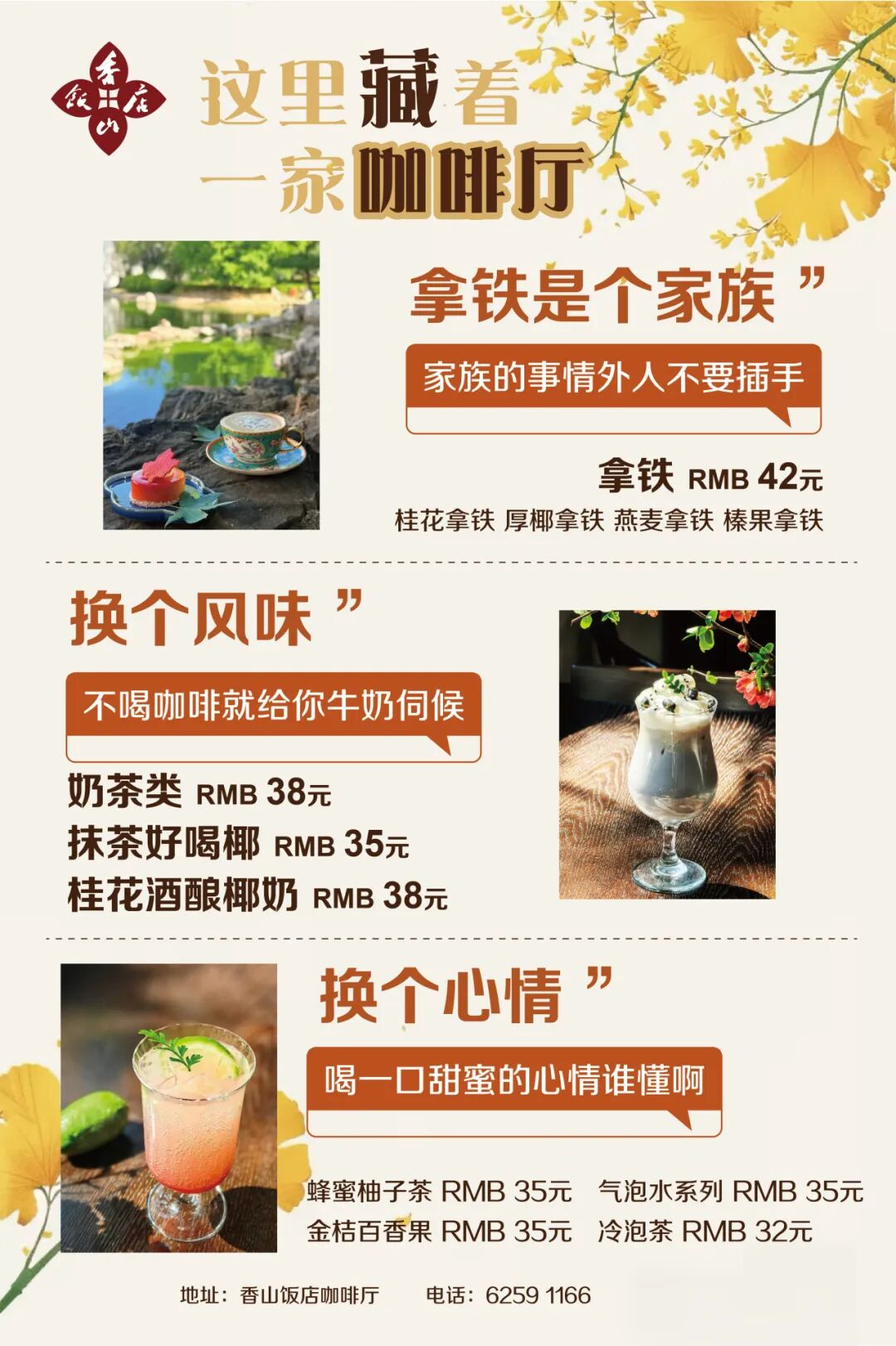 藏于香山饭店内的咖啡厅,为秋意注入了香甜暖意。多款特色暖饮,邀您在漫步山林后,于此小憩,品味秋日的独家风味。