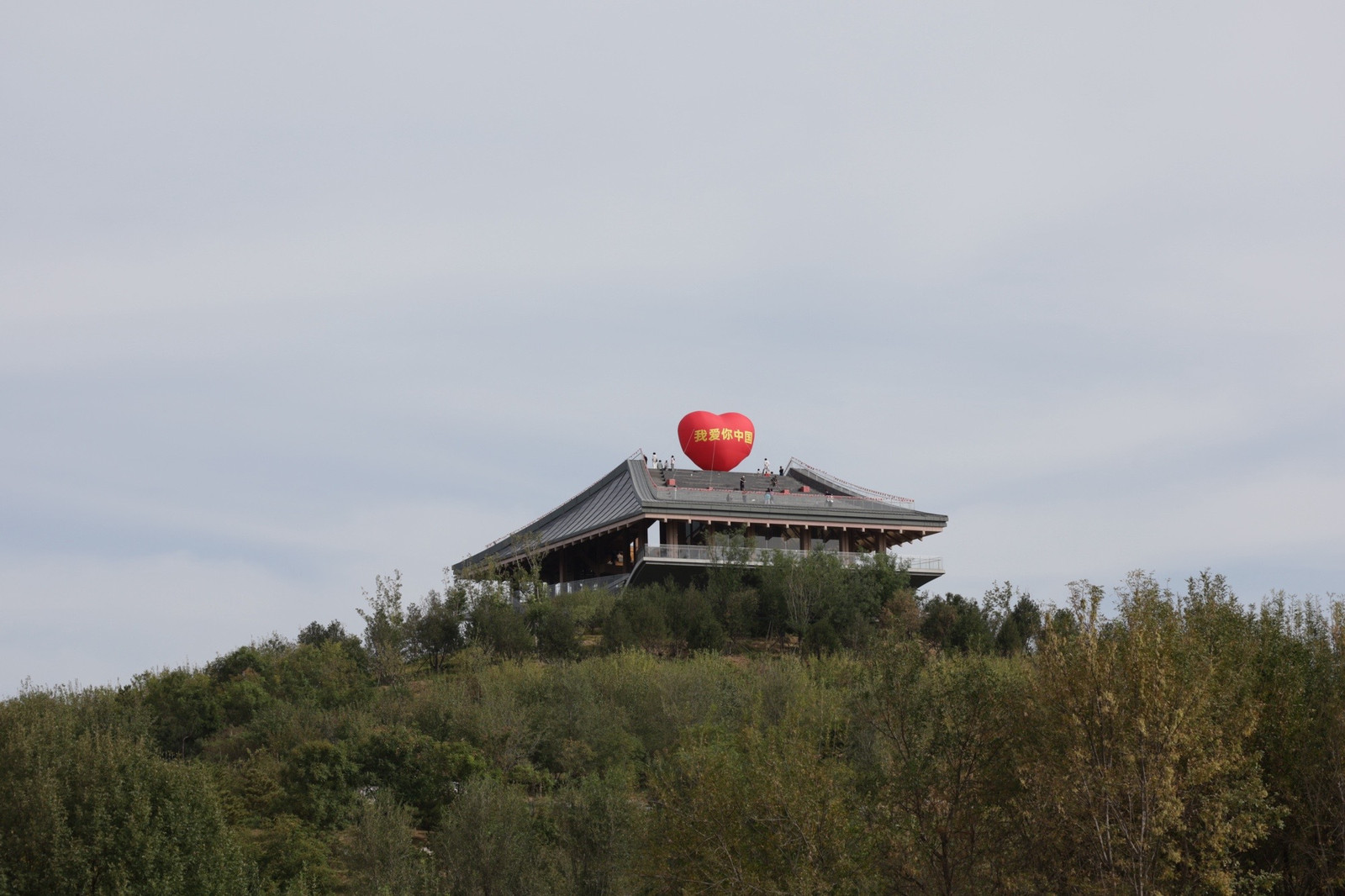 还记得去年“十一”当天燕景台上飘扬的五星红旗吗?当长21米宽14米的国旗被徐徐展开时,震撼感满满。上午10时30分,这份与国同庆的红色情感再度具象,燕景台上升起了直径8米的一颗红心,上面写着“我爱你中国”几个大字,在“南囿秋风”的绿色海洋上,成为醒目的视觉焦点。
