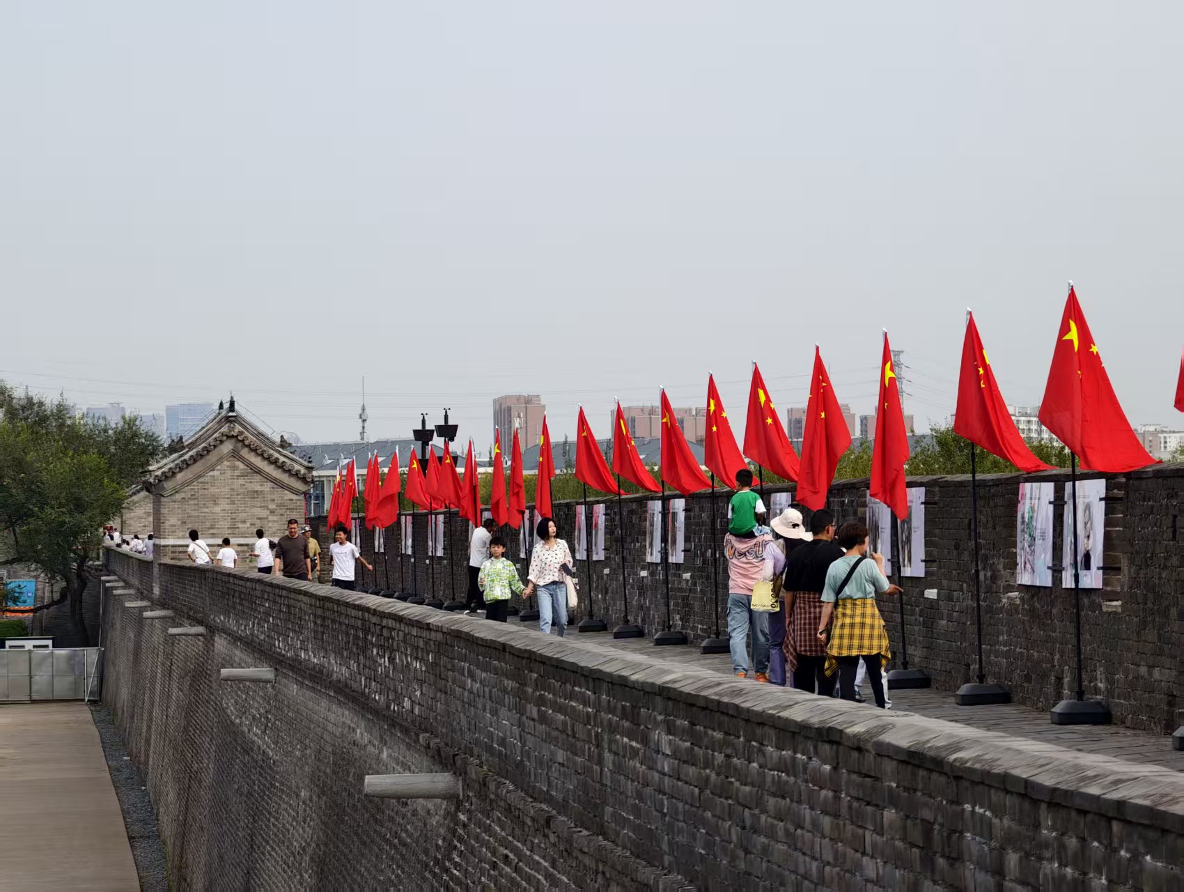 城墙上,无论是认识的还是不认识的,都在互相拍照,留下与国旗阵的合影,镜头之下,飘扬的红旗、古老的城垣和人们脸上洋溢的笑容,交相辉映。
