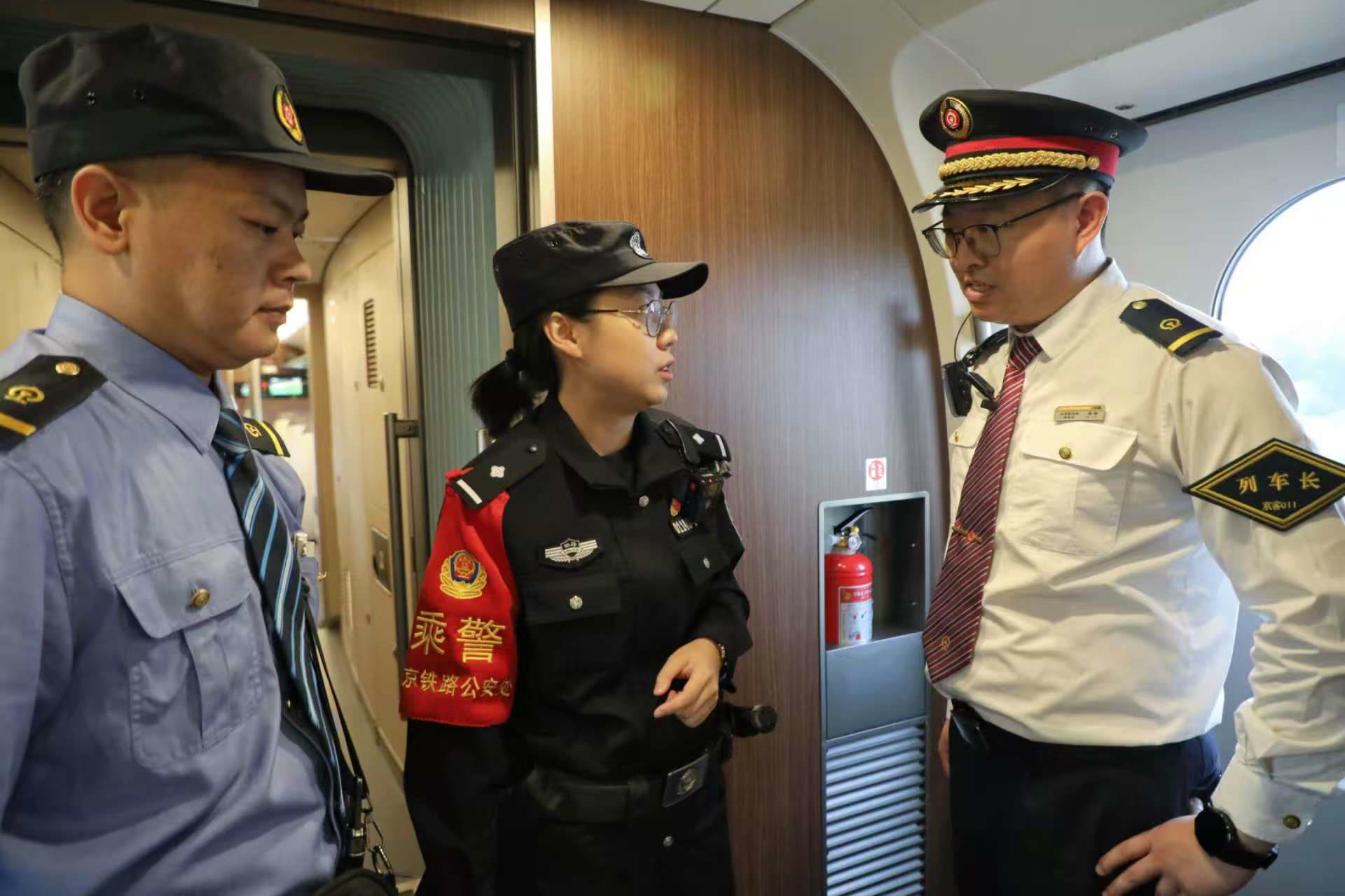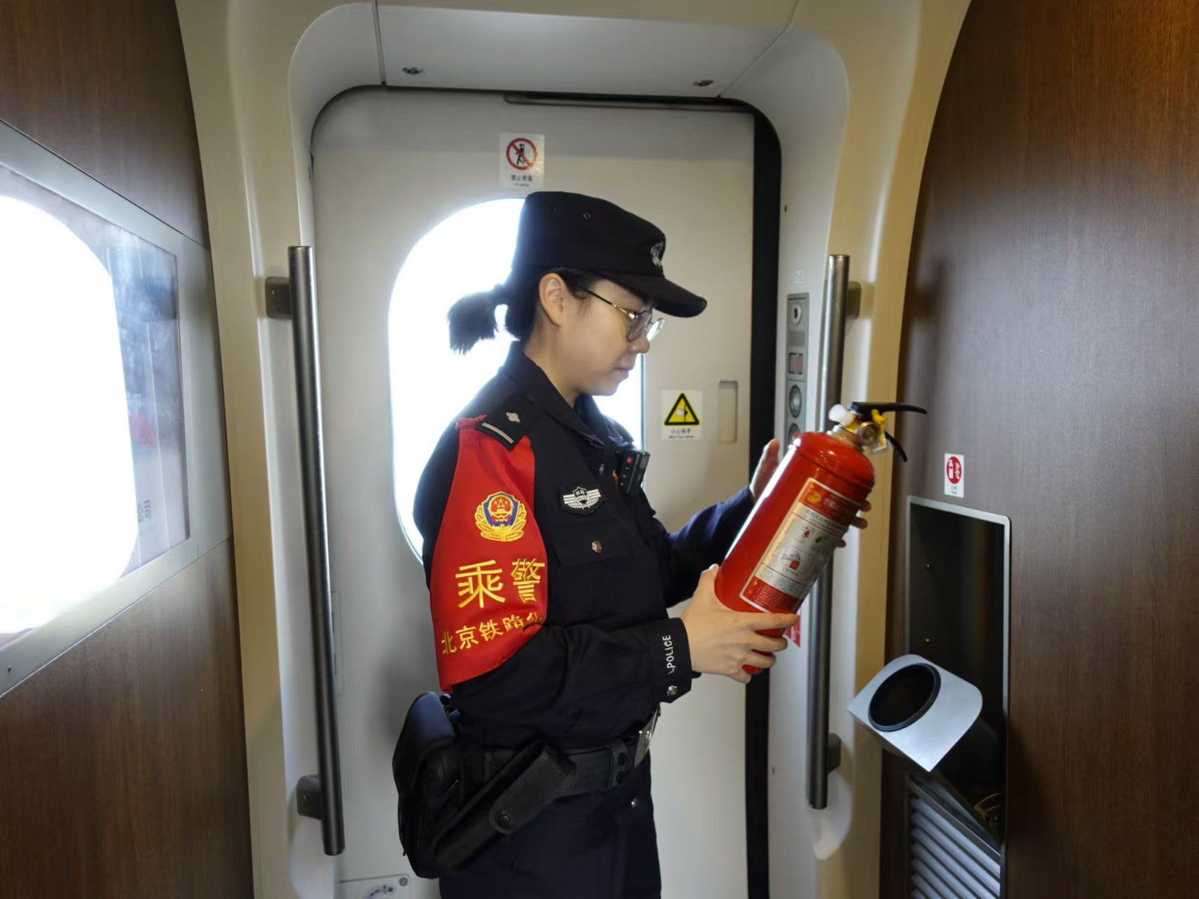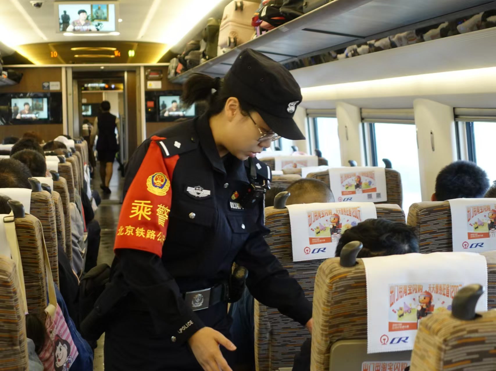 10月1日早晨6时许,北京铁路公安处乘警支队乘警徐晨,早早出现在值班室,穿戴整齐,做好值乘前的准备工作。国庆假期首日,作为G109次北京南-上海虹桥的京沪线高铁列车组乘警,她将护送一车旅客平安抵达目的地。