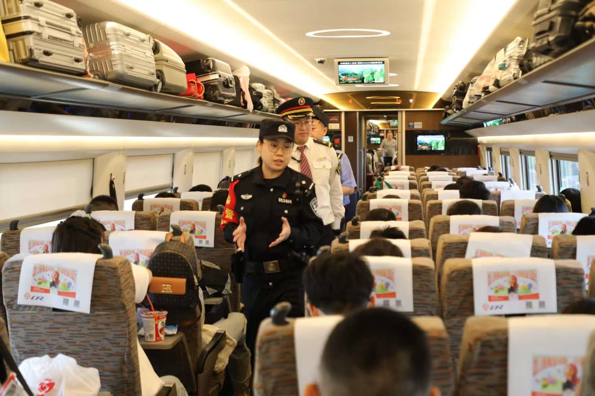 7时45分,徐晨值乘的G109次列车准时从北京南站驶出,车厢内座无虚席,连洗手台下的空间也放满了行李。G109次列车单趟时间长、停站多、客流集中,列车先后要停靠12个车站,旅客上下车频繁,容易发生拿错行李、东西丢失等突发状况。节假日客流量巨大,徐晨需要时刻绷紧心弦,加倍细心地巡视观察。