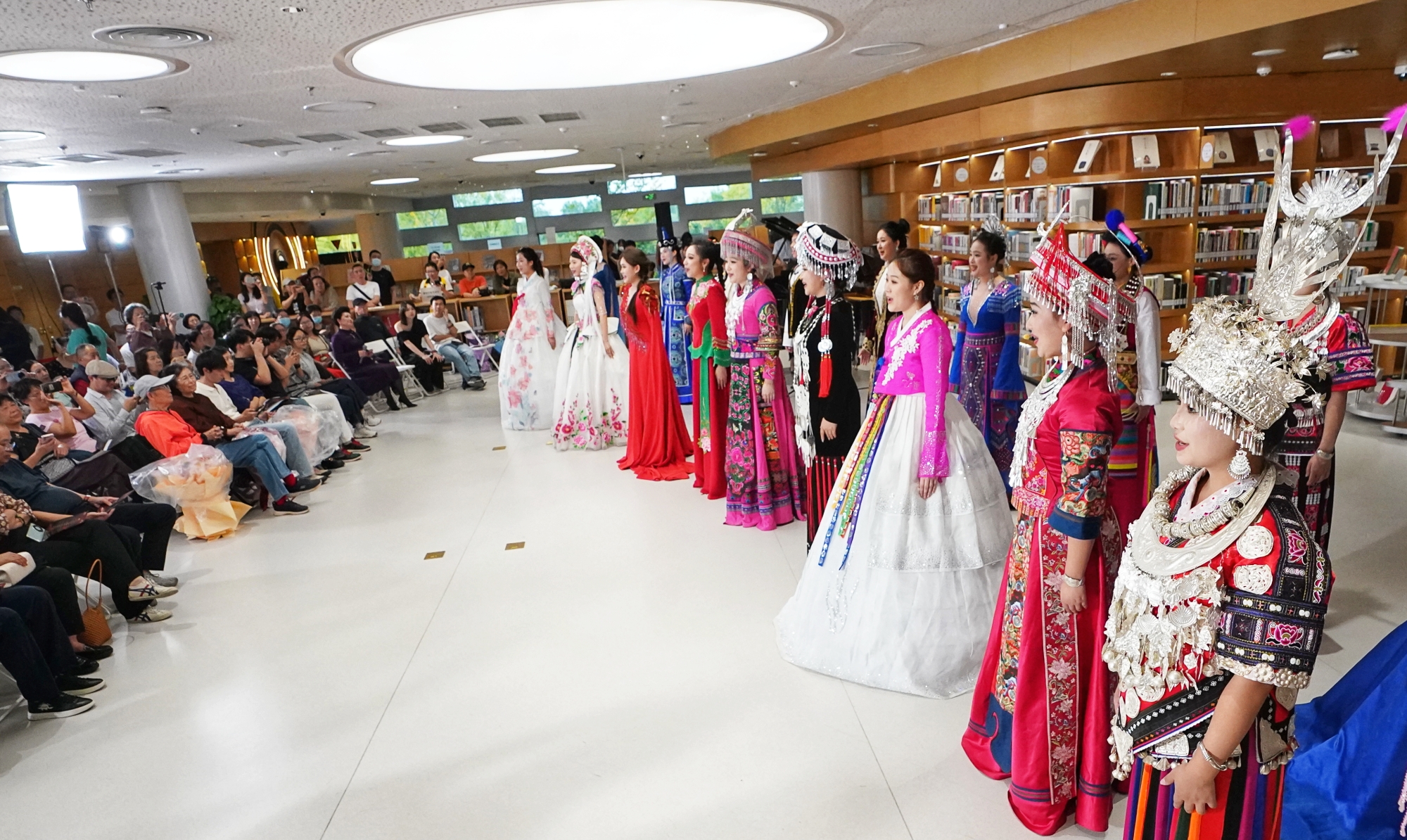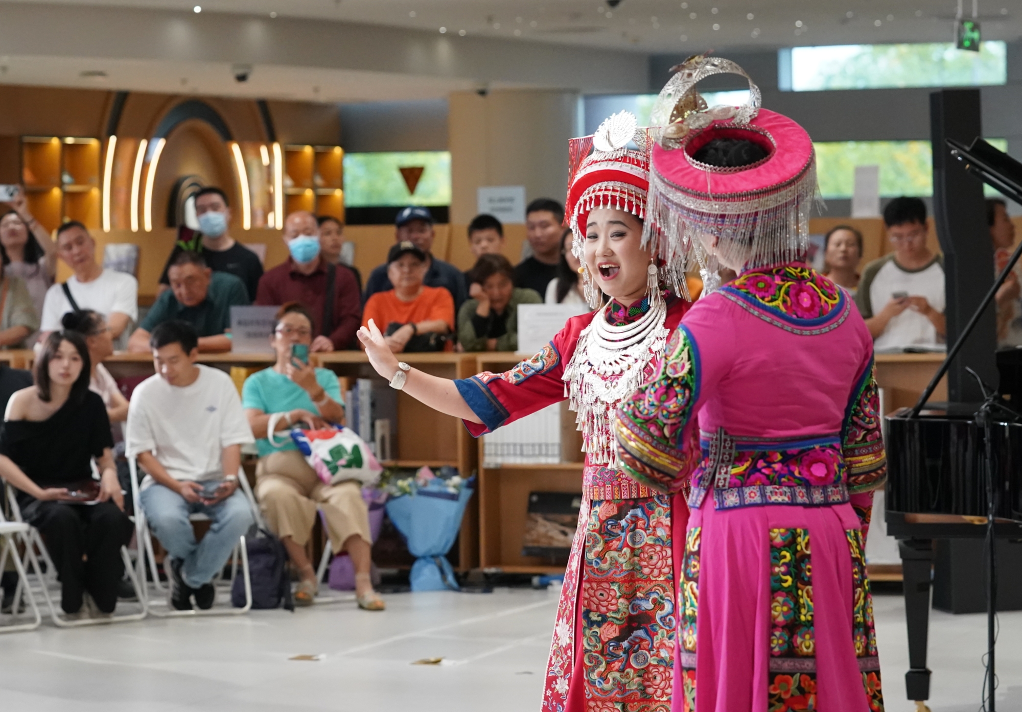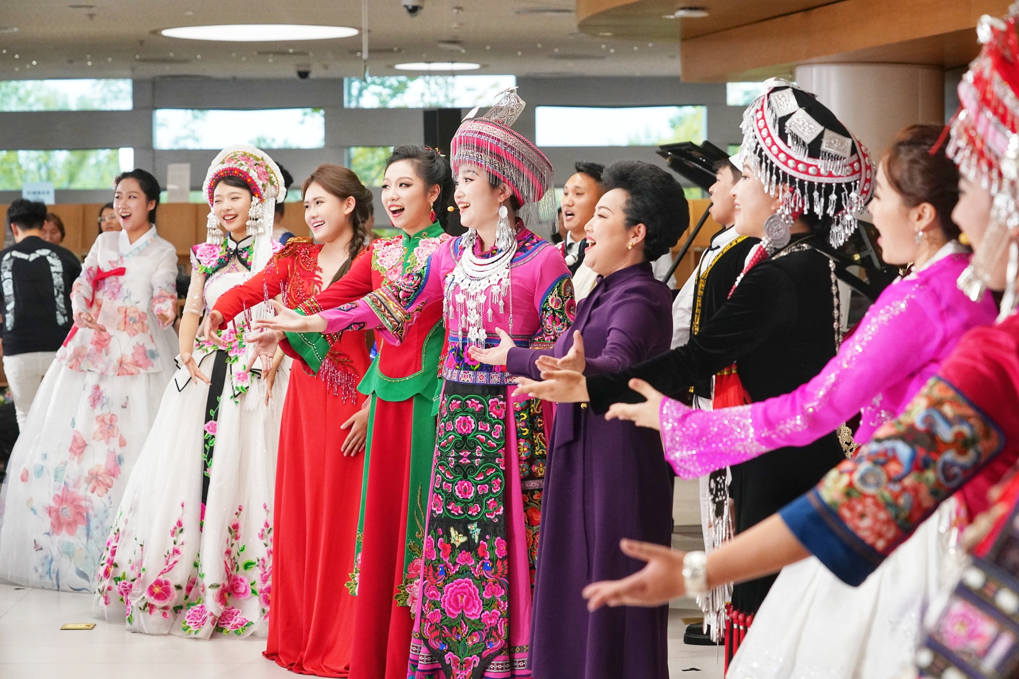 婉转优美的歌声传来,下午,“石榴花开·声颂华诞——多民族歌曲音乐会”正在艺术文献馆艺空间举行。中央民族大学音乐学院韩昌梅教授和她的学生、共同演绎藏族、黎族、朝鲜族、苗族、彝族、维吾尔族、土家族等多民族经典旋律。表演者还共同唱响《今天是你的生日,我的中国》《我和我的祖国》,以合唱凝聚深情,用音乐绽放民族团结之花。