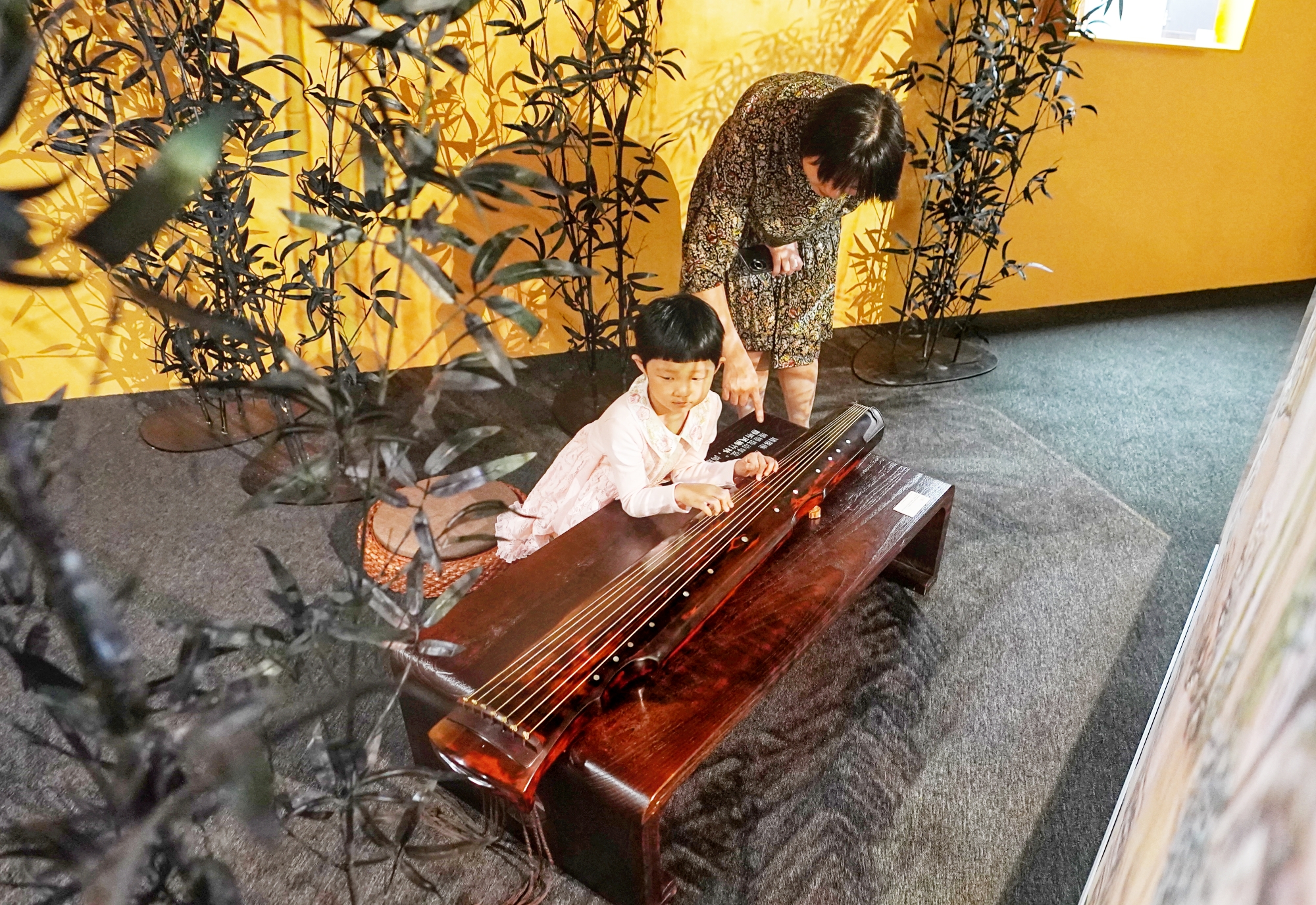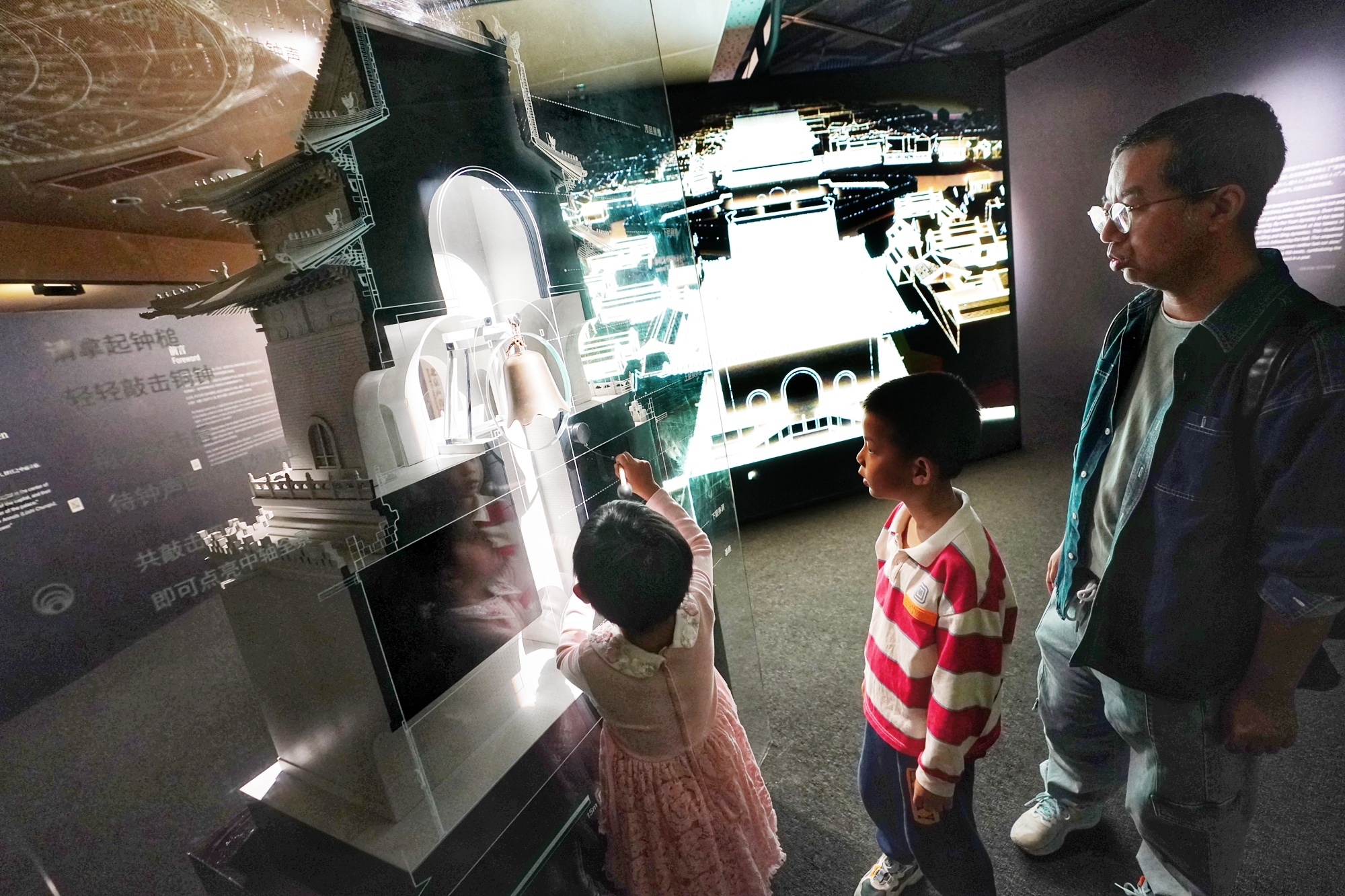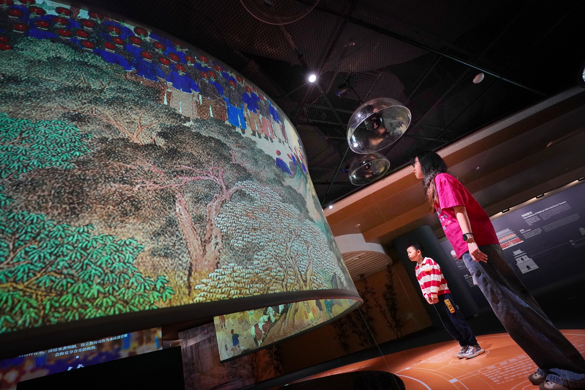 在“声游北京——聆听‘中轴’声音艺术展”漫游,观众收获着惊喜。育才小学二年级学生李锦渲拿起钟槌,轻轻敲击铜钟四次,大屏幕上的中轴线全景瞬间点亮,景象壮观。李锦渲还坐在古琴前,学着古人的样子缓缓拨动琴弦,感受静听风拂竹林,鸿雁入曲的意境。了解《鲜花调》工尺谱、聆听清代市井民俗音乐文化精髓之作的《平韵串》,用心感受优美古琴曲,观众高占会连连感叹,“太美了,心一下子就静下来了,以这样生动的形式感受北京中轴线文化,收获很大。”
