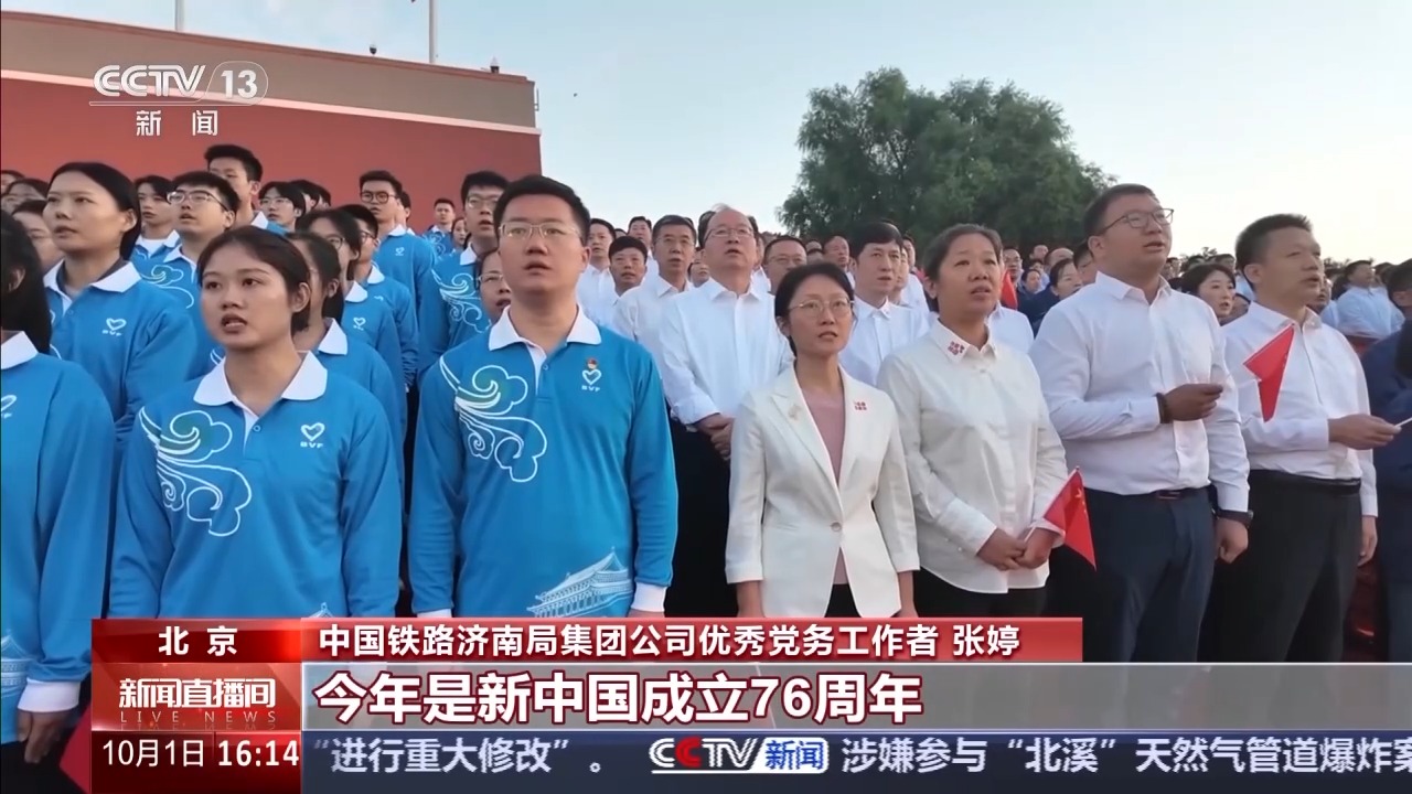 中国铁路济南局集团公司优秀党务工作者 张婷:国歌奏响、国旗升起的时候,我内心特别激动和自豪。今年是新中国成立76周年,作为一名新时代的铁路工作者,我们亲眼见证了中国铁路从“追赶”到“领跑”,实现了质的飞跃。祝愿我们伟大的祖国繁荣昌盛、国泰民安。