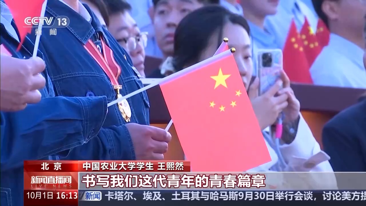 中国农业大学学生 王熙然:看到五星红旗在晨光中冉冉升起的那一刻,我内心非常激动、自豪。两年前,习近平总书记给我们中国农业大学科技小院的同学们的回信中,鼓励我们要“在服务乡村振兴中解民生 治学问”。作为一名农大学子,未来我将以先辈为榜样,深耕农业领域,书写我们这代青年的青春篇章。