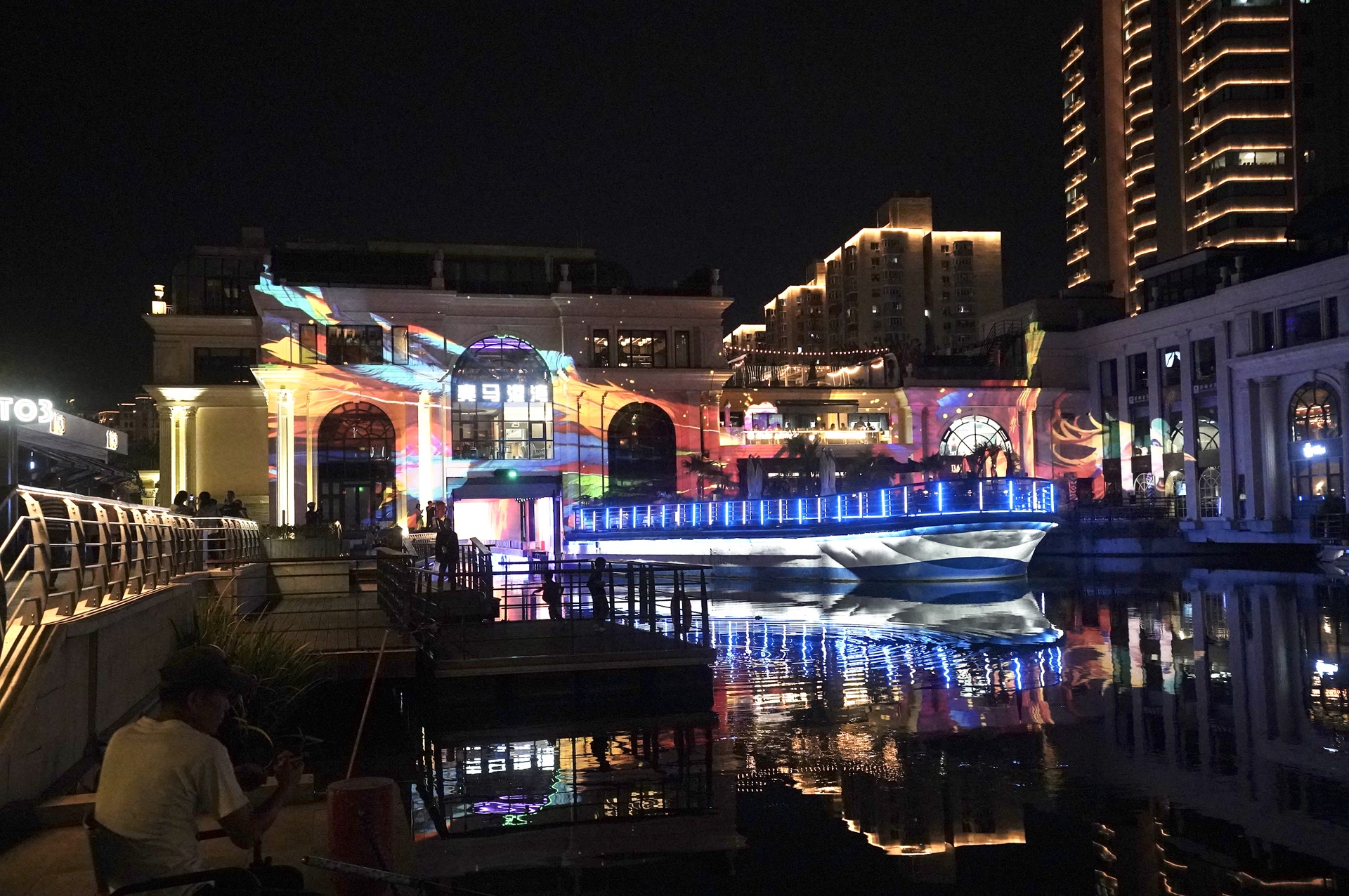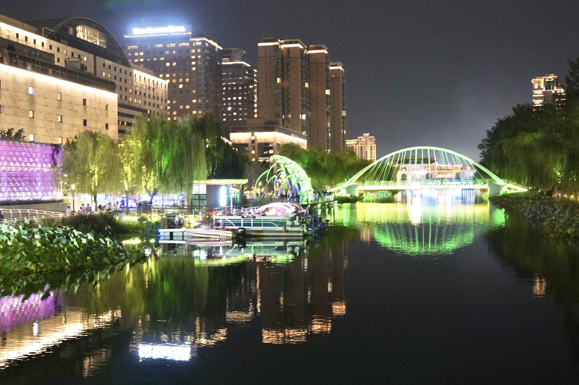亮马港湾是河流上的一组建筑群,主体是铂宫船闸,游船在上下游之间穿行时,需要这座船闸调节水位。长假期间,亮马港湾上演了国风满满的灯光秀,灯光投射在建筑群的外立面,一朵朵荷花唯美绽放,红鲤、凤凰自在嬉游。