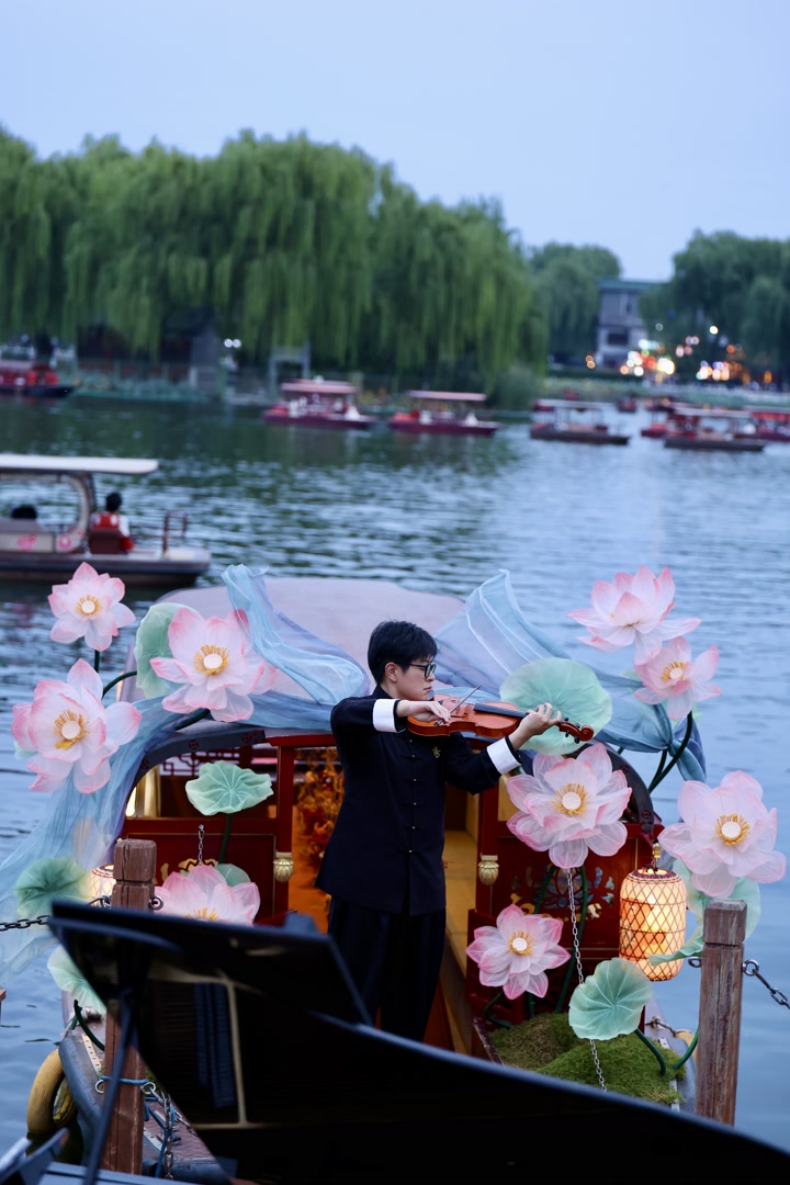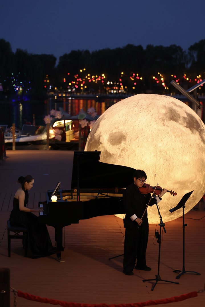 一个高达3米的大型月球灯、一架三角钢琴、一把小提琴,搭建起一处别出心裁的“大片儿”摄影角,这里也是本次活动的第一个舞台。夕阳西下,演出者的指尖在琴键上跳跃,音符在水面上跳舞,中外名曲与什刹景色完美交融。