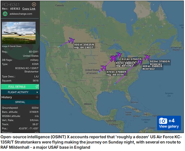 近日,美军KC-135R/T加油机机群从美本土飞往欧洲,这意味着北约或有“大动作”。据开源网络情报(OSINT)信息显示,当地时间9月28日晚,约12架美空军KC-135R/T“同温层加油机”从本土起飞,飞越大西洋,其中部分加油机飞往英国皇家空军米尔登霍尔基地。英媒援引美防务消息人士的话分析称,此次部署“意义重大”,上次美空军出动如此多的空中加油机,是在对伊朗核设施发动空袭的五天前。