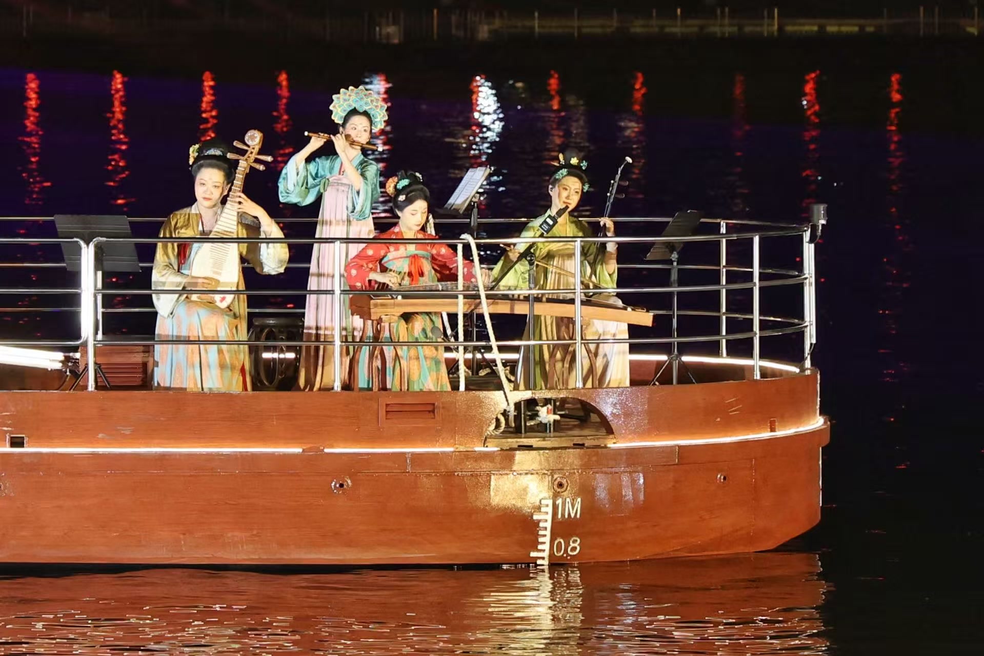 不同于传统的时尚秀场,本届运河文化时尚大赏将千年大运河水域化作天然舞台。核心水域上,琵琶船载“二十四伎乐”奏响国风音律,水面荧光如银河倾落;演艺船载着模特缓缓驶来,华服与水光相映成趣,构建出“水为琴弦,舟影成谱”的意境。