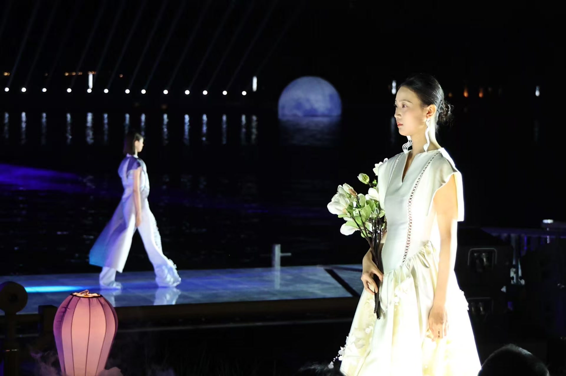 “水上红毯”环节以阿卡贝拉(无伴奏合唱)启幕,岸边灯光勾勒码头轮廓,水幕投影流转运河古今景象。模特踏上T台时,LED地屏波光随步态起伏,音乐相伴其间,打造出沉浸式“时空漫游”体验。现场观众表示:“走进了运河的历史文化”。