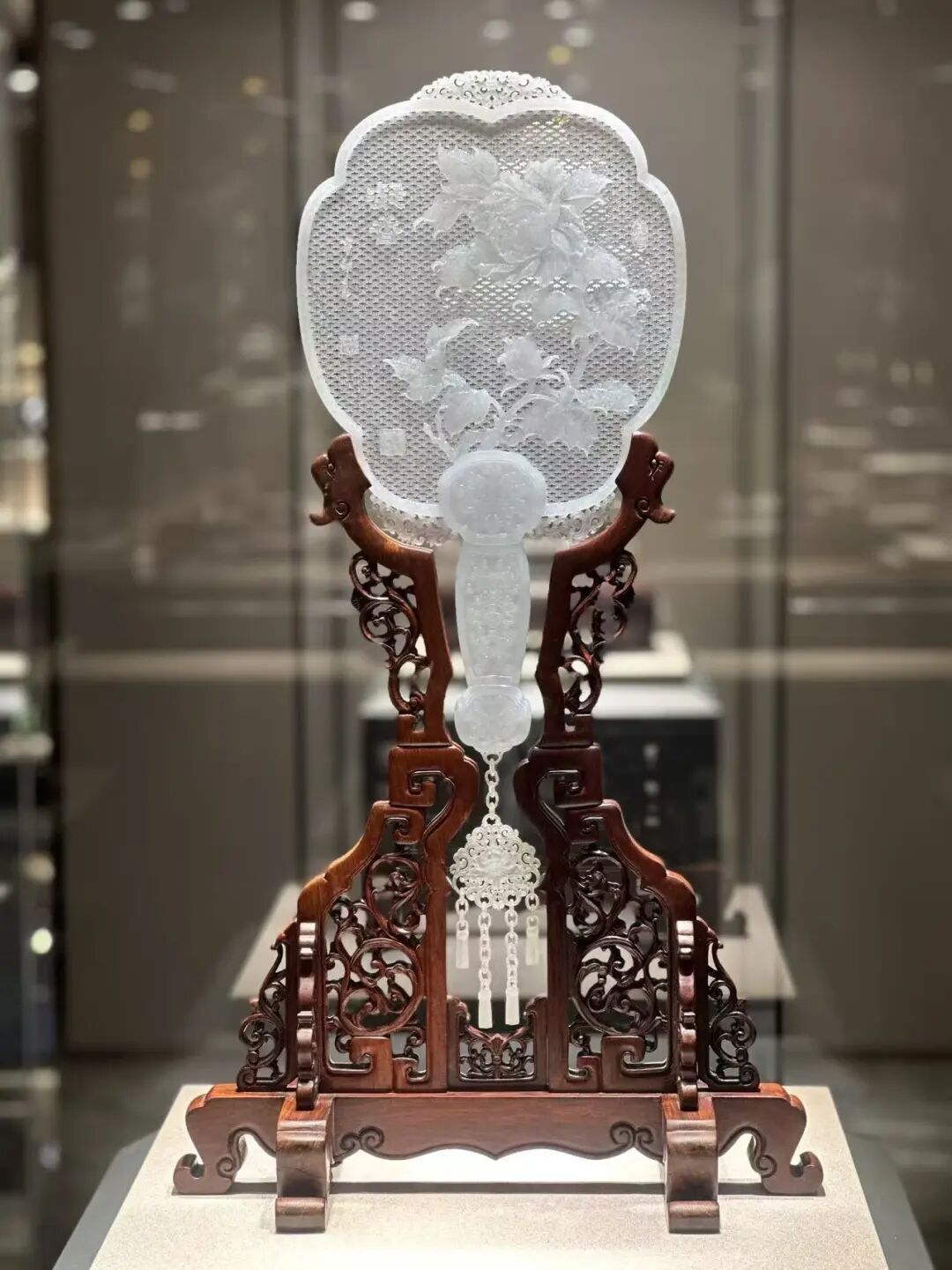 在他的工作室里,一件件作品见证着技艺的突破:《花开富贵团扇》扇面薄如蝉翼,1573个透眼纱眼玲珑剔透;《翡翠螭龙单链瓶》链环细若毫米,螭龙栩栩如生;《守护》则巧妙运用玉料颜色,将青龙、白虎、朱雀、玄武融于一方汉代瓦当造型之中。
