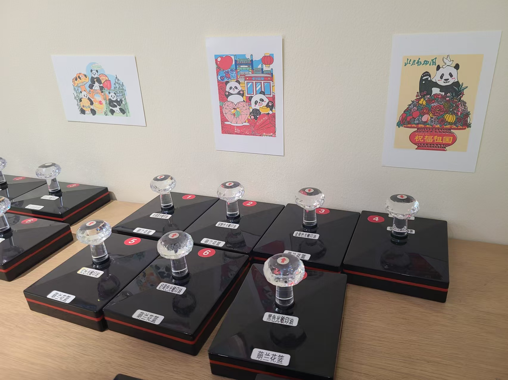 在文创店的集章区,不少游客正排队盖章。一位背着熊猫图案帆布包的女士表示:“我特别喜欢‘萌兰’,今天专程来收集‘萌兰花篮’套色章,真是开心的假期体验。”