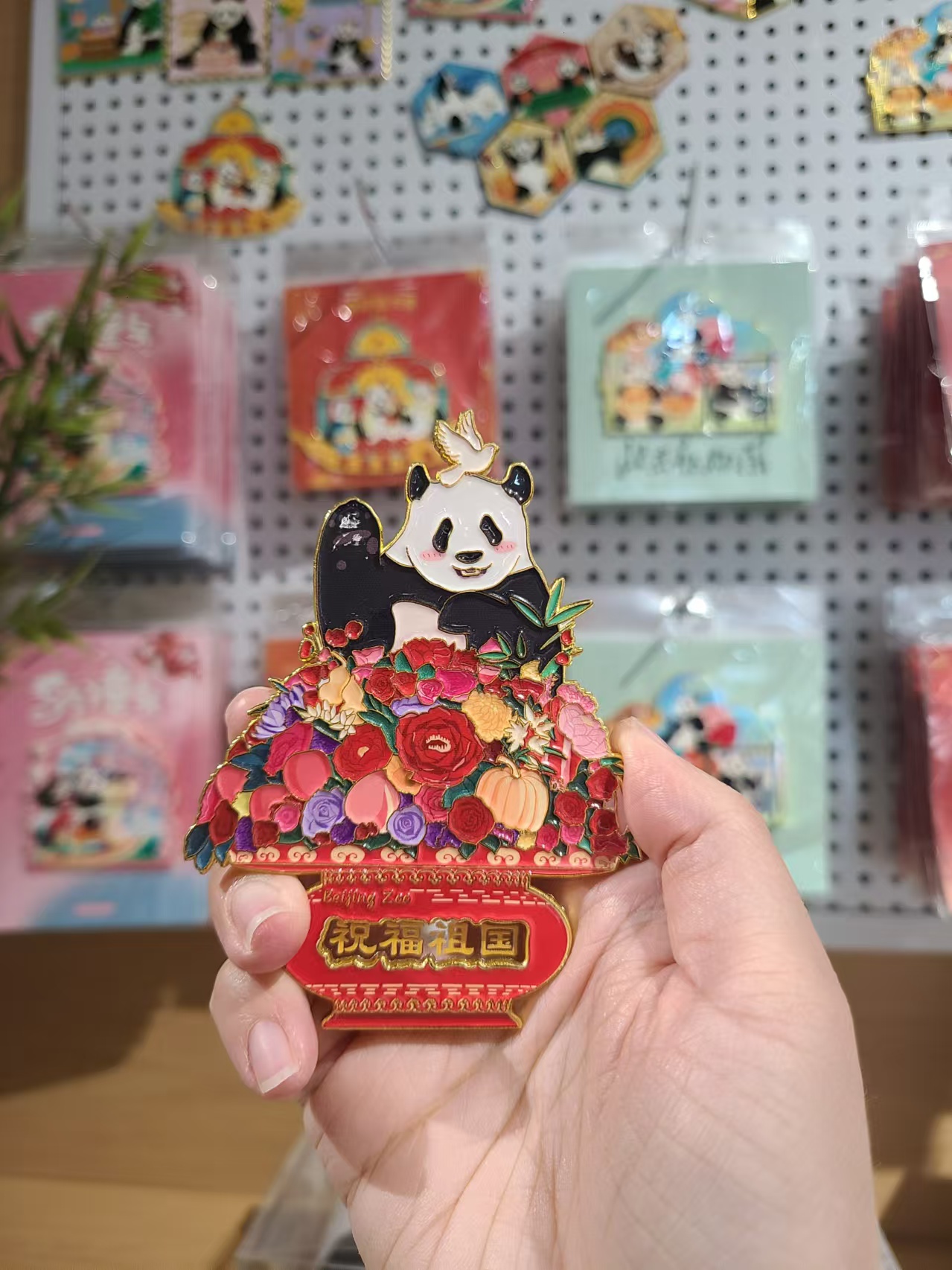 紧邻乐园的“萌主驾到”北动主题文创店内也是人头攒动。新推出的“熊猫祝福祖国亮灯冰箱贴”成了热销爆款,憨态可掬的熊猫站在“祝福祖国”大花篮上挥手致意,轻拨背后的开关,“祝福祖国”四字便会亮起,既应景又喜庆。“正值国庆假期,这款卖得最好,‘熊猫全家福’冰箱贴也很受欢迎。”店员说。
