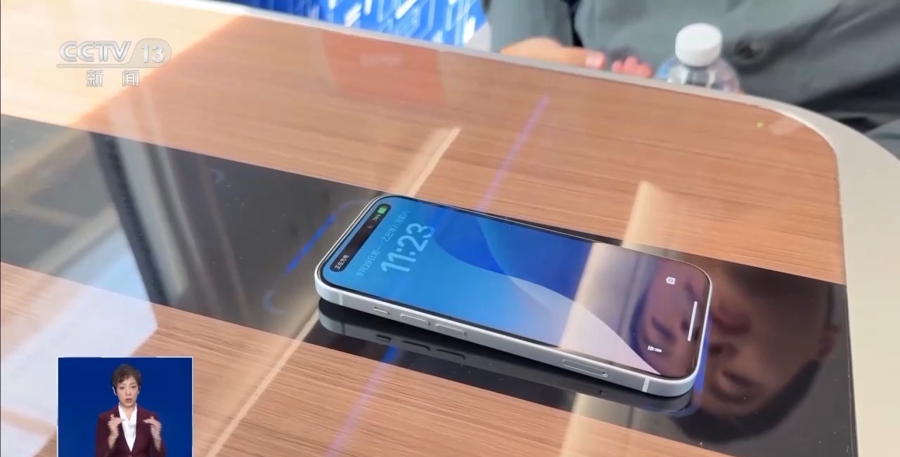通过这块“大型触摸屏”,旅客既可观看宣传片,查看列车运行信息,也可一键切换回透光模式欣赏窗外风景。此外,座椅小桌板集成无线充电功能,并配有手机充电口。