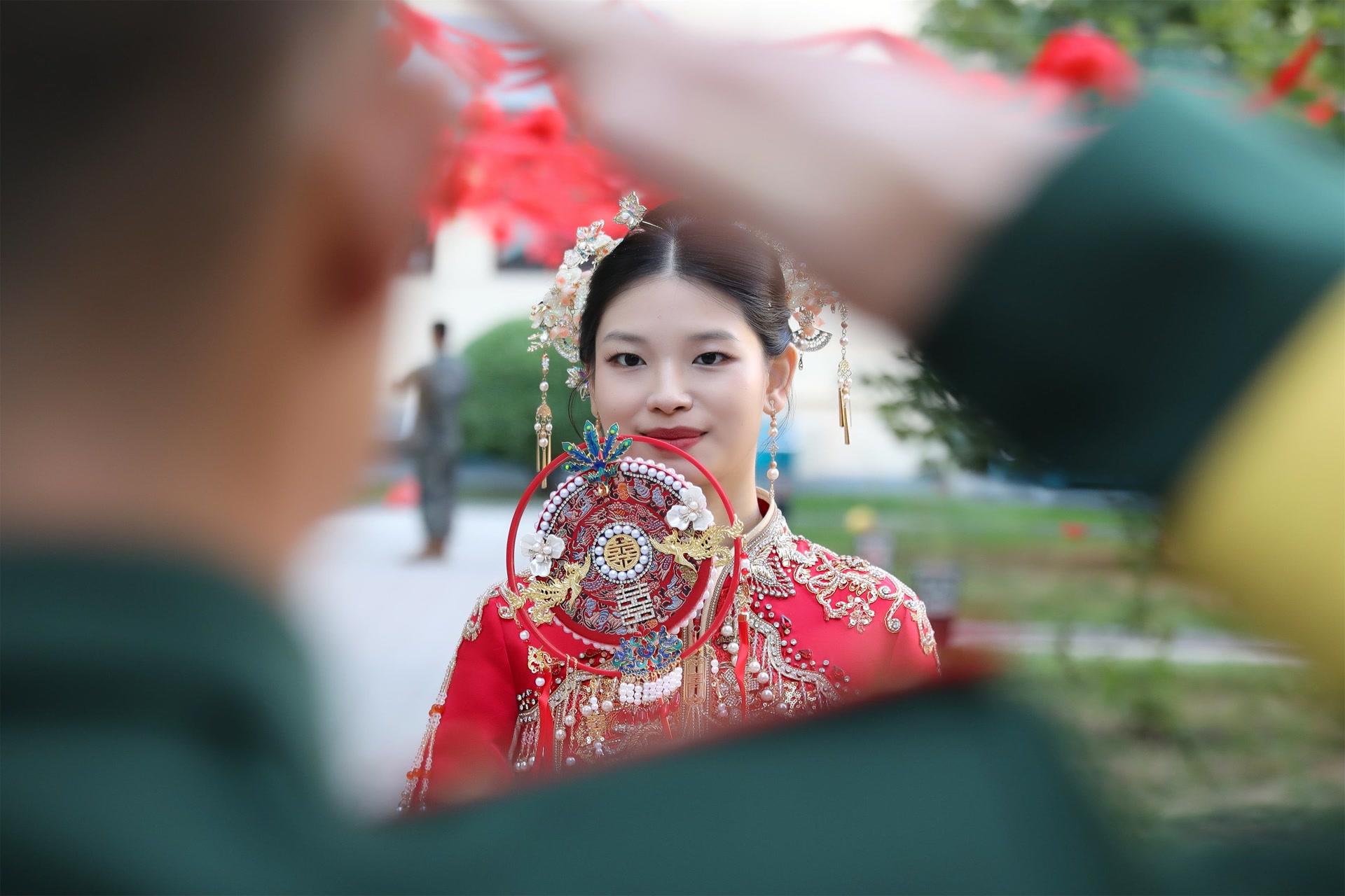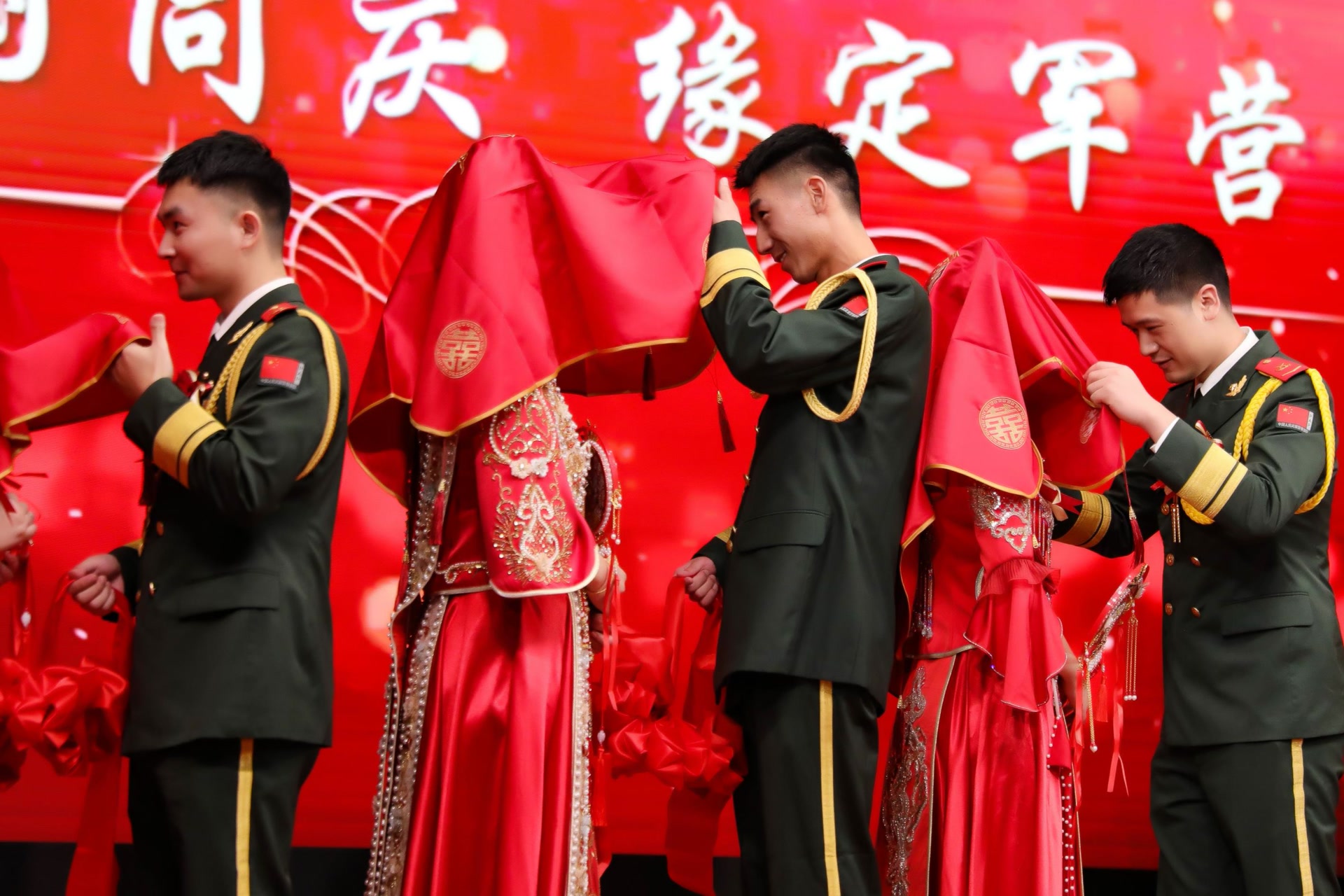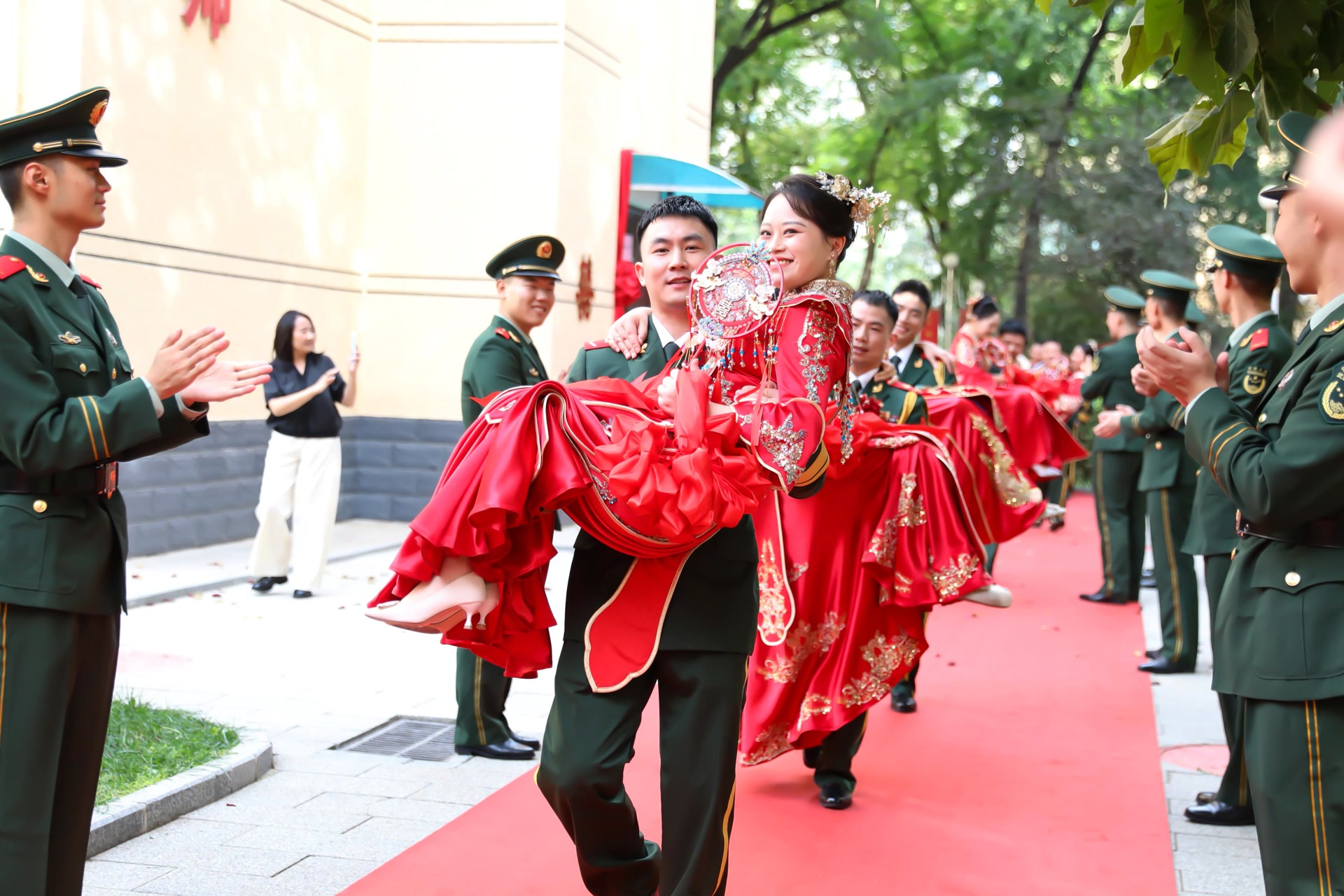 “正步走”,一声庄严的号令,40名礼兵高举象征信任与托付的红盖头,走向10位新娘为她们带去对美好生活的祈愿。“吉时到!”随着主持人庄严宣告,上午9时38分婚礼仪式正式开始。在激扬的军乐声中,新人携手跨马鞍,跨火盆,踏上红火喜庆的婚礼舞台,寓意日子红红火火、生活平平安安。新人依次完成三挑盖头、签订婚书、共饮“福禄酒”等仪式,既有传统婚嫁的温婉韵味,更有军营婚礼的独特庄重。“左手牵你,右手敬礼,不负祖国不负卿!”新郎们举起右手向新娘敬上标准军礼,这一饱含责任与深情的动作,将军人的忠诚与柔情展现得淋漓尽致,瞬间点燃现场气氛,浪漫与忠诚在此刻完美交融。