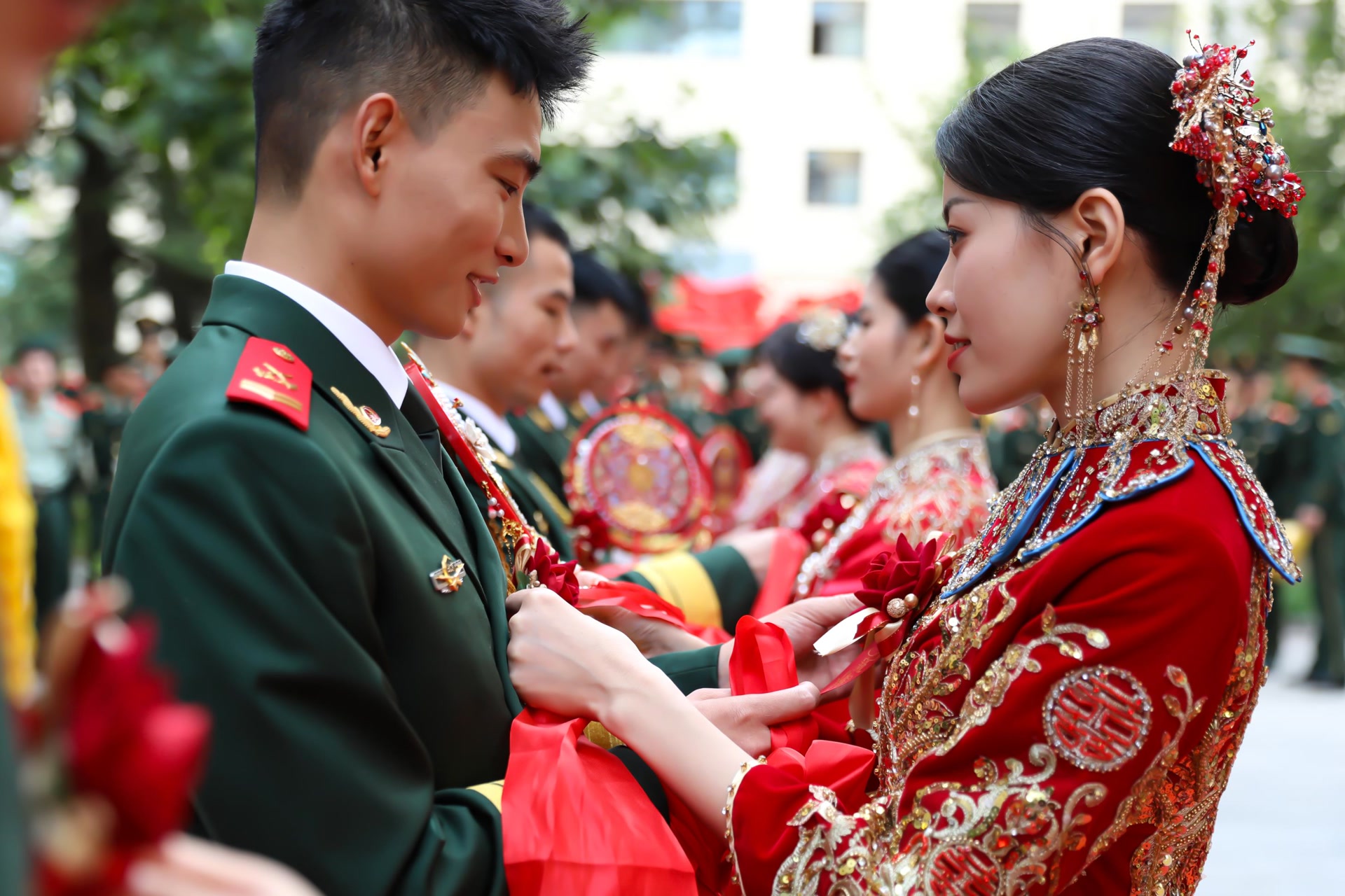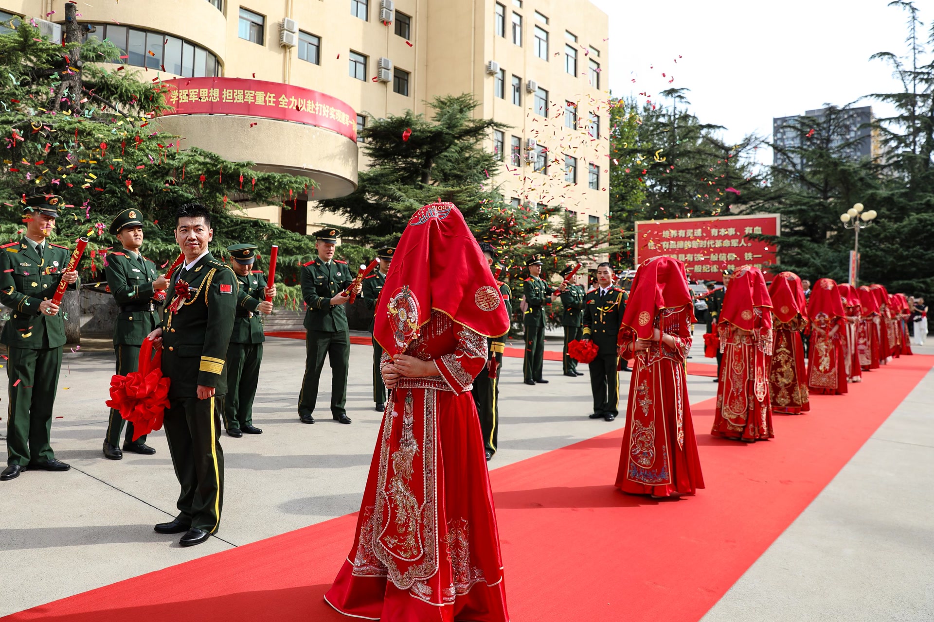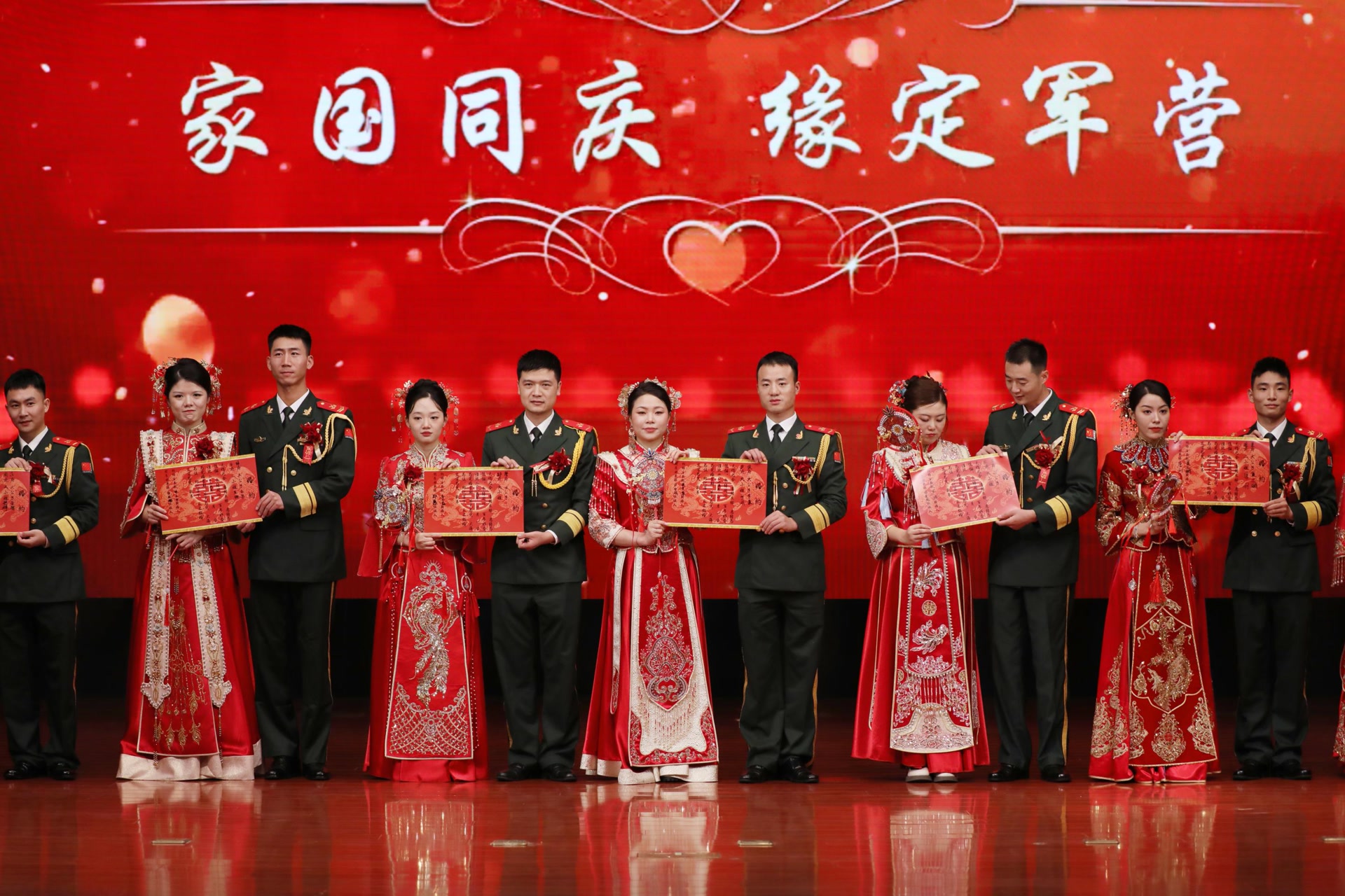 10月1日清晨,在举国欢庆的日子里,武警北京总队执勤第六支队营区内彩旗飘扬、礼乐喧天。10对身着军装与嫁衣的新人,在战友、亲属的共同见证下,携手步入婚姻殿堂。