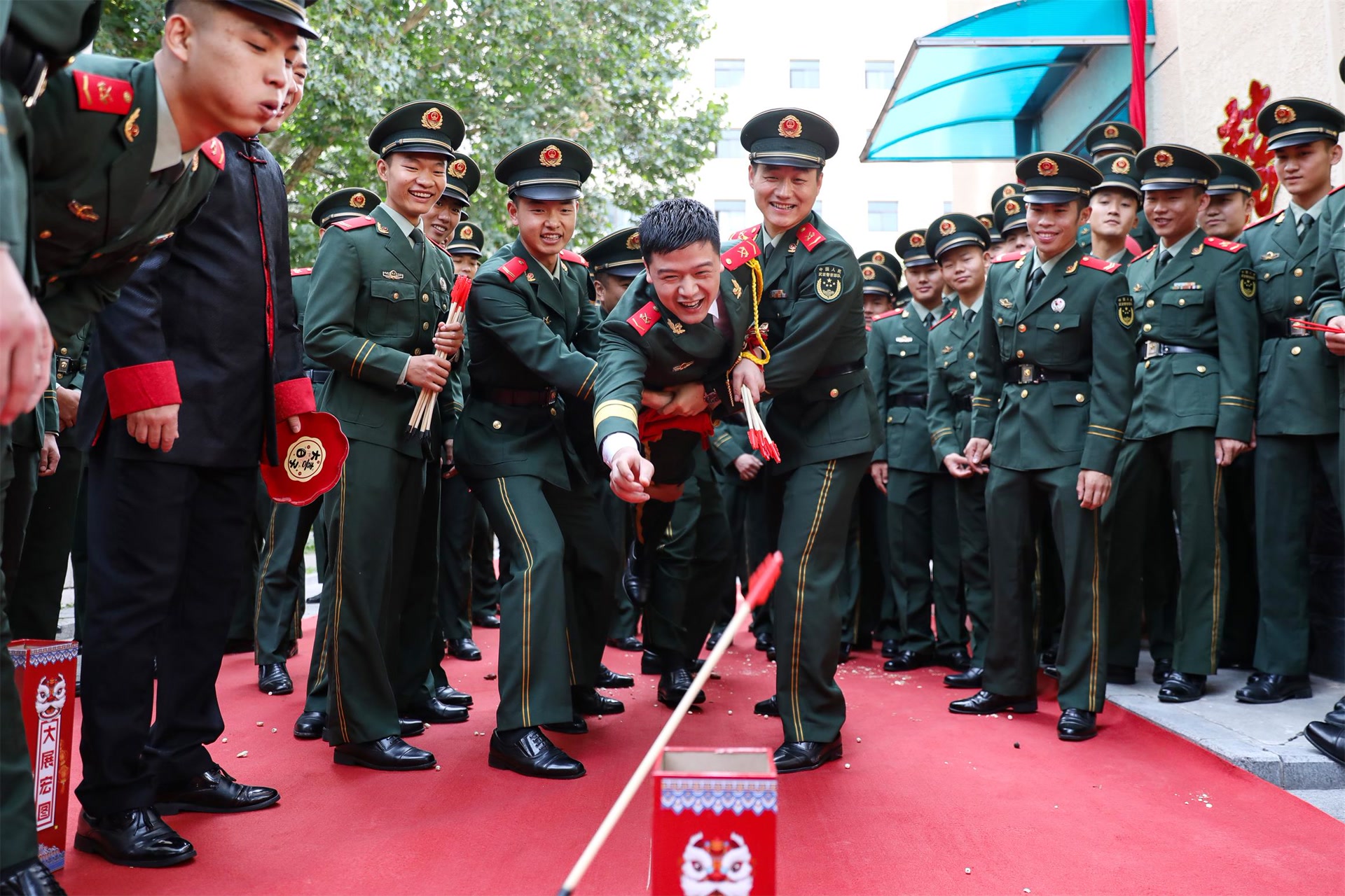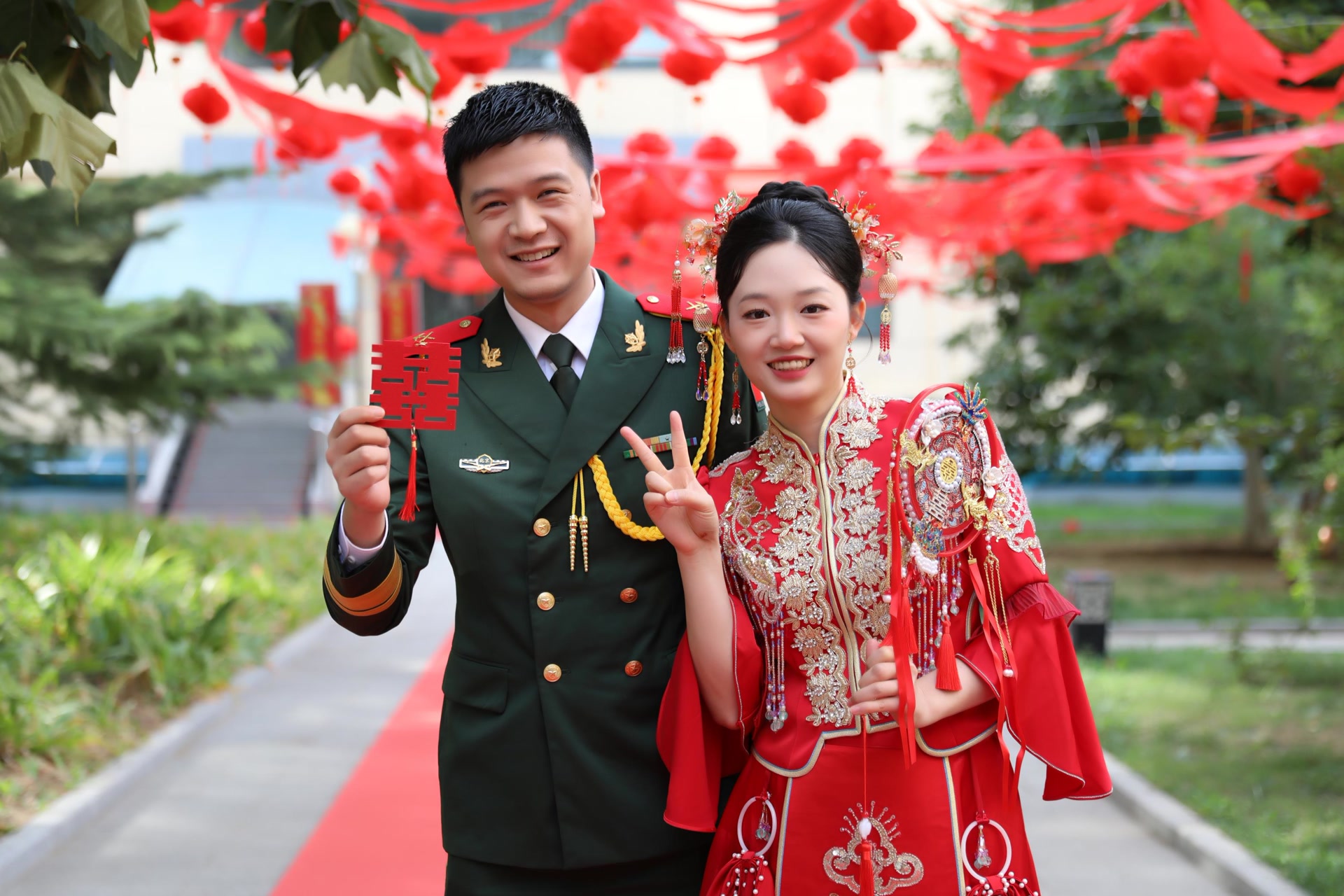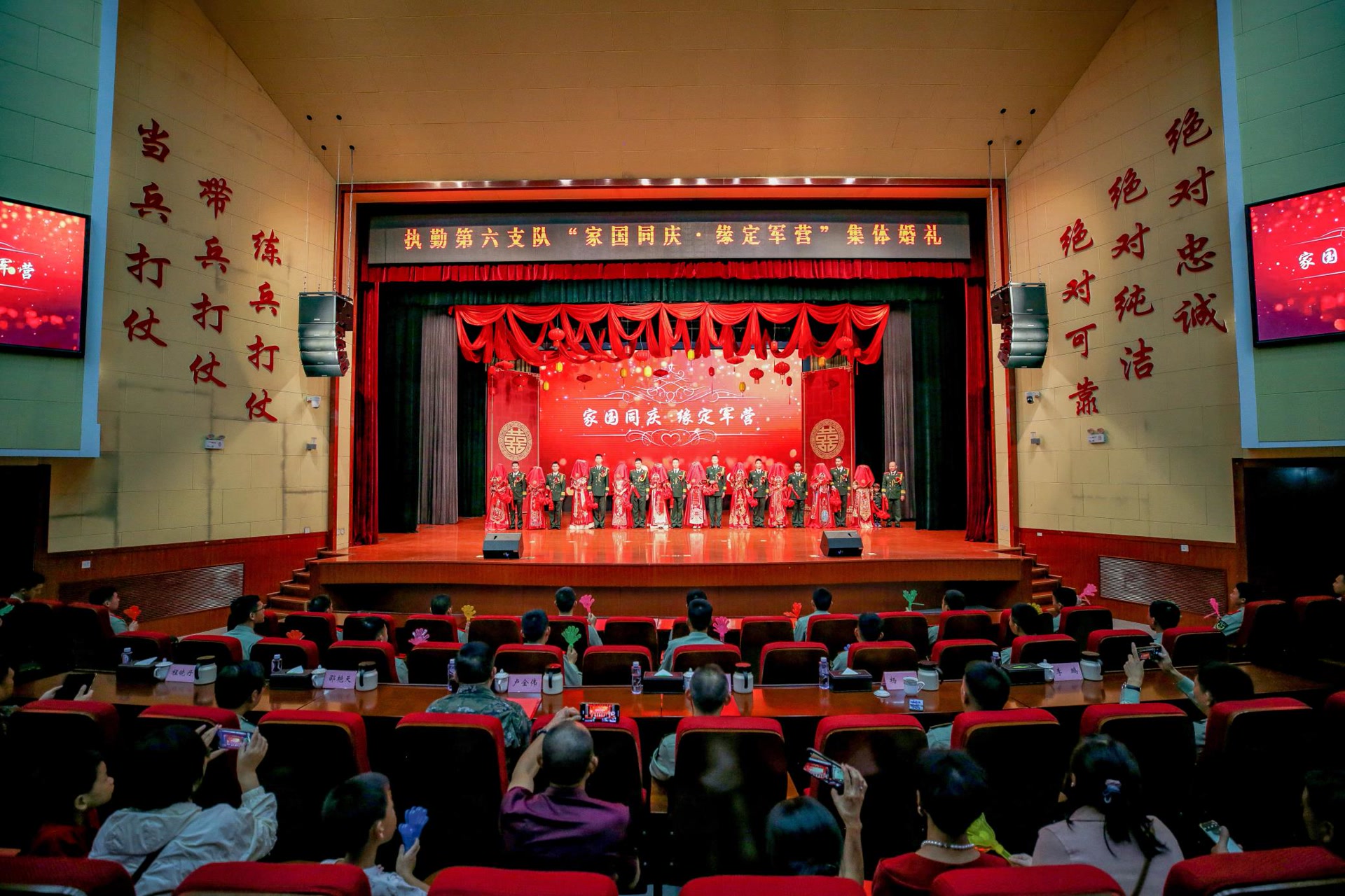 10月1日清晨,在举国欢庆的日子里,武警北京总队执勤第六支队营区内彩旗飘扬、礼乐喧天。10对身着军装与嫁衣的新人,在战友、亲属的共同见证下,携手步入婚姻殿堂。