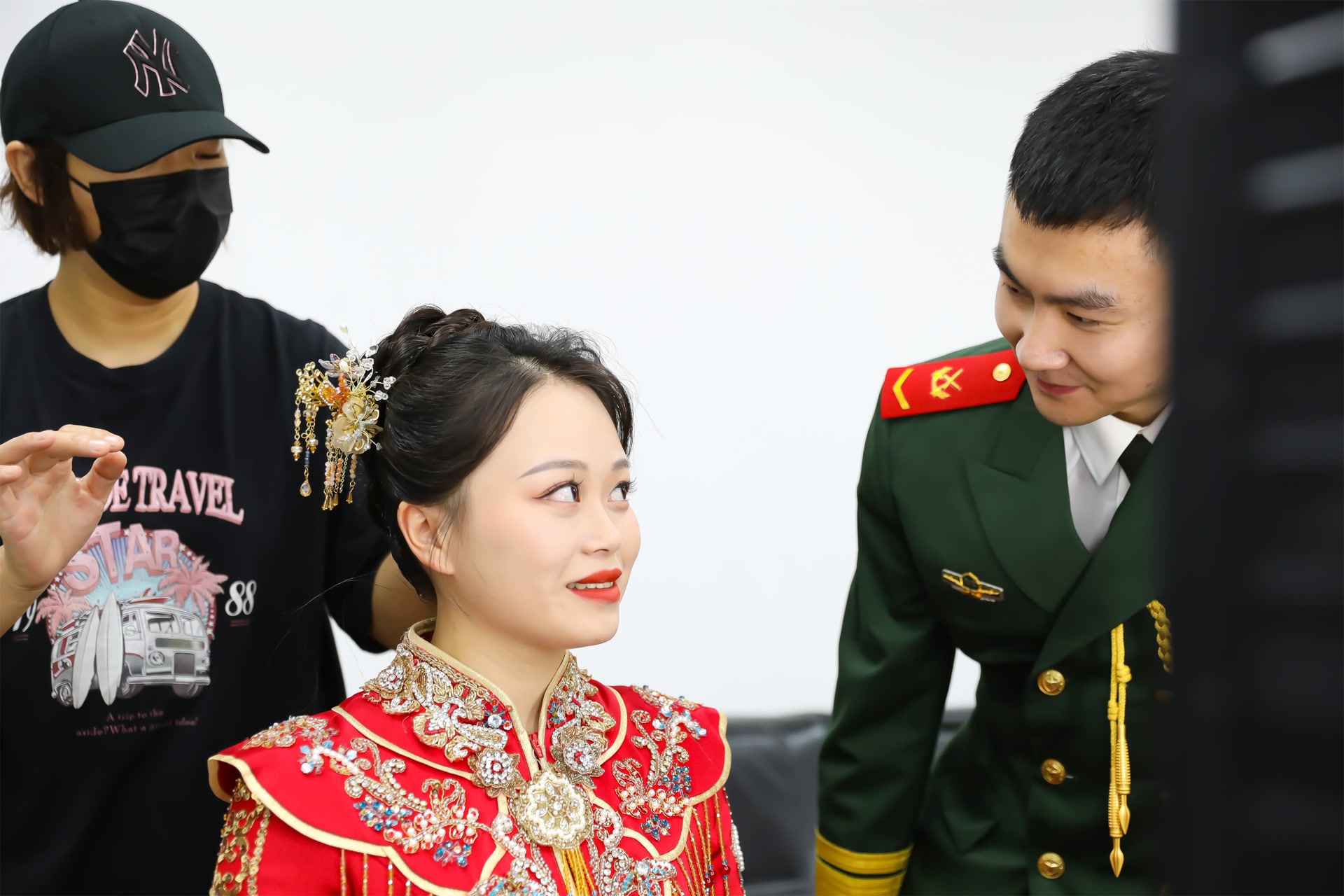 清晨的营区早已洋溢着幸福气息。营区临时改造的化妆间已是灯火通明,10位新娘端坐于迷彩梳妆台轻点朱唇、巧挽发髻,镜中秀禾服的朱红与窗外国旗的鲜红交相辉映,新娘们指尖轻抚嫁衣刺绣,眼底满是对幸福的期盼。新郎们身着笔挺礼服英姿飒爽,神情庄重也难掩喜色,他说“右手敬礼祖国,左手许她一生”,她说“你守卫祖国,我守护小家”,梳妆间里时时响起阵阵幸福的笑声。