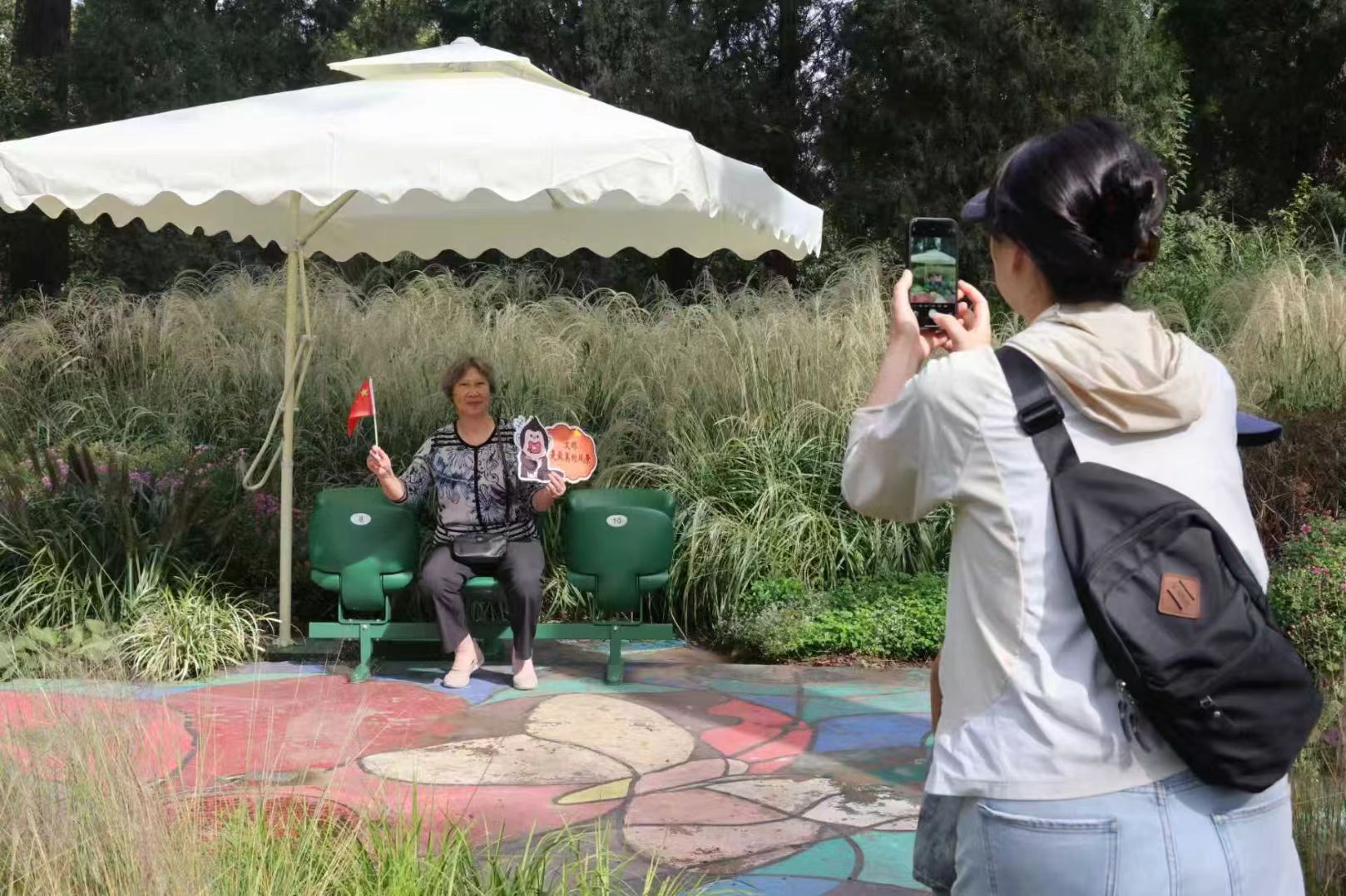 国庆中秋假期,陶然亭公园国庆主题景观、爱国红色游活动与阅兵观礼椅打卡点,让游客在赏秋游园中沉浸式体验爱国氛围,尽享秋日美好。公园东门内广场“我爱你中国 爱心传递”打卡点人气爆棚,游客纷纷上前按动按钮,参与爱心传递,表白对祖国的深情祝福。江亭观鱼南侧红色邮品展售区,市民游客驻足“赏邮品之韵 忆历史之章”主题活动,挑选特色邮品,加盖限定邮戳,氛围感瞬时拉满。在公园南线花街湖畔,7组阅兵观礼座椅成为陶然亭公园近期新晋的网红打卡地,不少市民游客慕名前来,拍下自己打卡阅兵观礼椅的照片,休憩、赏景,抒情寄怀。