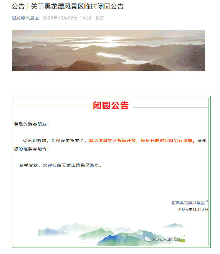 北京黑龙潭风景区10月2日发布闭园公告:受汛期影响,为保障游览安全,黑龙潭风景区暂停开放,恢复开放时间将另行通知。